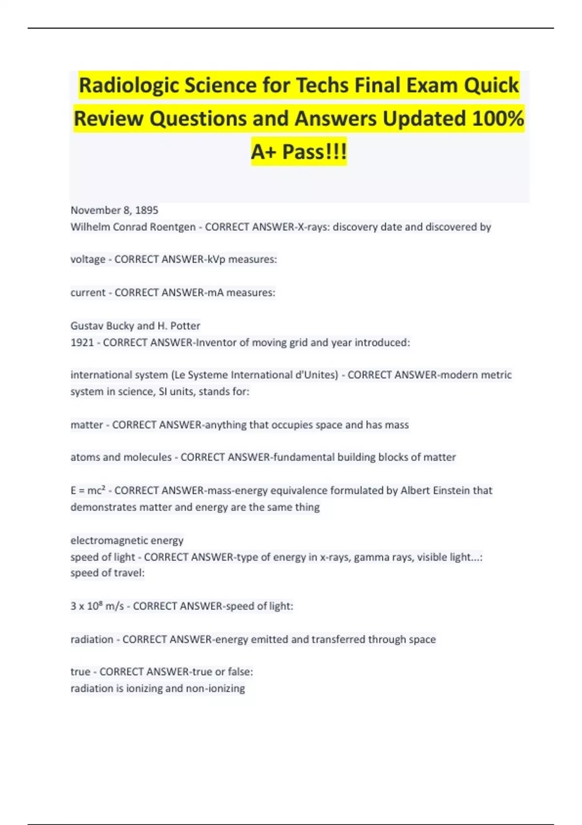Radiologic Science for Techs Final Exam Quick Review Questions and Answers Updated 100% A+ Pass!!! November 8, 1895 Wilhelm Conrad Roentgen - CORRECT ANSWER-X-rays: discovery date and discovered by voltage - CORRECT ANSWER-kVp measures: current - CORRECT ANSWER-mA measures: Gustav Bucky and H. Potter 1921 - CORRECT ANSWER-Inventor of moving grid and year introduced: international system (Le Systeme International d'Unites) - CORRECT ANSWER-modern metric system in science, SI units, stands for: matter - CORRECT ANSWER-anything that occupies space and has mass atoms and molecules - CORRECT ANSWER-fundamental building blocks of matter E = mc² - CORRECT ANSWER-mass-energy equivalence formulated by Albert Einstein that demonstrates matter and energy are the same thing electromagnetic energy speed of light - CORRECT ANSWER-type of energy in x-rays, gamma rays, visible light...: speed of travel: 3 x 10⁸ m/s - CORRECT ANSWER-speed of light: radiation - CORRECT ANSWER-energy emitted and transferred through space true - CORRECT ANSWER-true or false: radiation is ionizing and non-ionizing ionization - CORRECT ANSWER-this occurs when an electromagnetic wave, or subatomic particle, has enough energy to remove an orbital electron from an atom x-rays, gamma rays, ultraviolet light - CORRECT ANSWER-forms of electromagnetic radiation with enough energy to ionize alpha and beta particles - CORRECT ANSWER-particle type of radiation with enough energy to ionize base quantities - CORRECT ANSWER-building blocs of all other quantities (mass, length, time) mass kilograms (kg) - CORRECT ANSWER-quantity of matter contained in any physical object: unit of measurement: true - CORRECT ANSWER-true or false: mass remains unchanged regardless of state derived quantities - CORRECT ANSWER-a combination of one or more base quantities (volume, velocity, acceleration, force..) Wt = mg, where m = mass, g = gravity Newton (N) - CORRECT ANSWER-formula for weight: SI unit: weight - CORRECT ANSWER-the _____ of an object can change depending on gravity, but the object's mass will always stay the same energy - CORRECT ANSWER-ability to do work Law of Conservation of Energy Law of Conservation of Matter - CORRECT ANSWER-laws that states that energy and matter can change from one form to another, but cannot be created or destroyed potential energy like a ball suspended above the ground - CORRECT ANSWER-ability to do work by virtue of position: example: PE = mgh, where m = mass, g = gravity, h = distance above the earth Joule (J) - CORRECT ANSWER-formula for potential energy: SI unit: kinetic energy like a ball falling to the ground - CORRECT ANSWER-the energy of motion: example: KE = ½mv², where m = mass, v = velocity Joule (J) - CORRECT ANSWER-formula for kinetic energy: SI unit: velocity (v) v = d/t, where d = distance, t = time m/s - CORRECT ANSWER-measure of how fast an object is moving: formula: SI unit: Acceleration (a) a = (final velocity - initial velocity)/t, where t = time m/s² - CORRECT ANSWER-the rate in change of veloicty over time: formula: SI unit: Work (W) W = Fd, where F = force, d = distance Joule (J) - CORRECT ANSWER-the force applied to an object times the distance over which that force is applied: formula: SI unit: power (P) P = W/t, where W = work, t = time Watts (w) - CORRECT ANSWER-the rate of doing work: formula: SI unit: