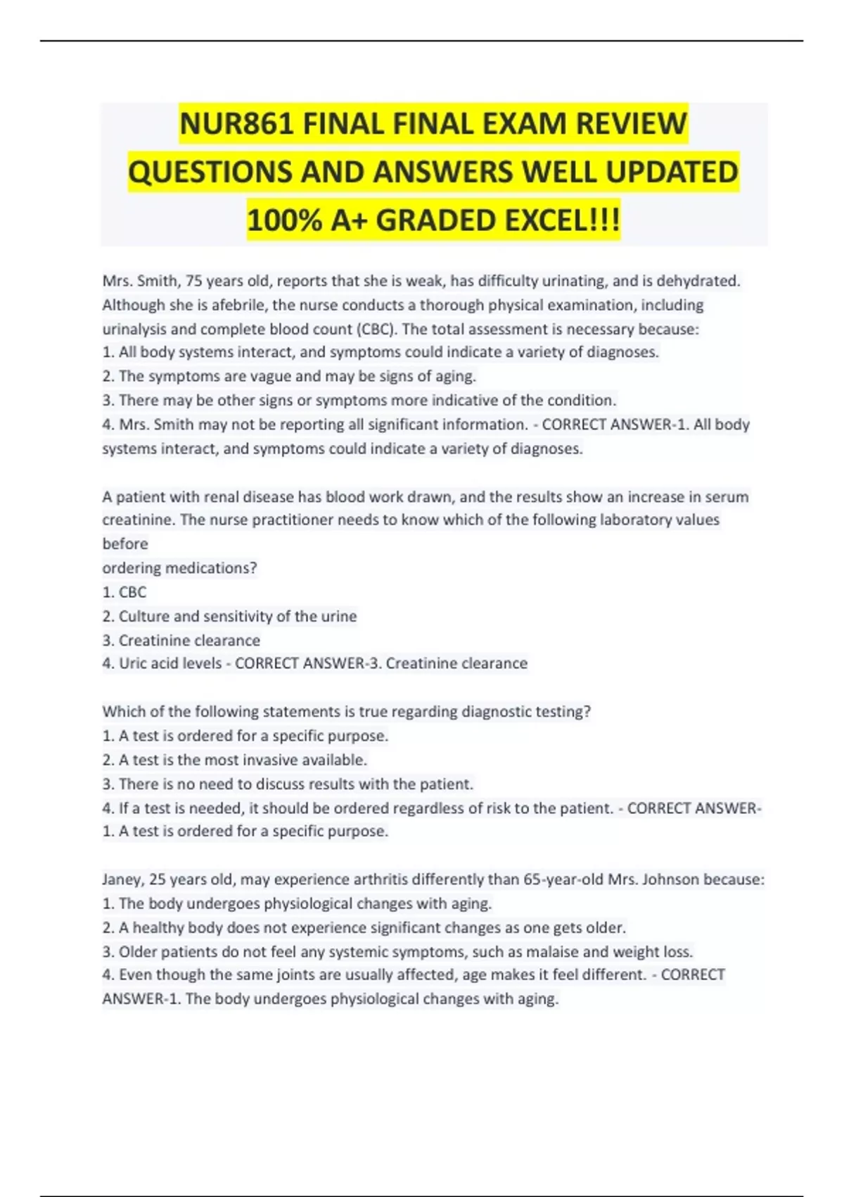 NUR861 FINAL FINAL EXAM REVIEW QUESTIONS AND ANSWERS WELL UPDATED 100% A+ GRADED EXCEL!!! Mrs. Smith, 75 years old, reports that she is weak, has difficulty urinating, and is dehydrated. Although she is afebrile, the nurse conducts a thorough physical examination, including urinalysis and complete blood count (CBC). The total assessment is necessary because: 1. All body systems interact, and symptoms could indicate a variety of diagnoses. 2. The symptoms are vague and may be signs of aging. 3. There may be other signs or symptoms more indicative of the condition. 4. Mrs. Smith may not be reporting all significant information. - CORRECT ANSWER-1. All body systems interact, and symptoms could indicate a variety of diagnoses. A patient with renal disease has blood work drawn, and the results show an increase in serum creatinine. The nurse practitioner needs to know which of the following laboratory values before ordering medications? 1. CBC 2. Culture and sensitivity of the urine 3. Creatinine clearance 4. Uric acid levels - CORRECT ANSWER-3. Creatinine clearance Which of the following statements is true regarding diagnostic testing? 1. A test is ordered for a specific purpose. 2. A test is the most invasive available. 3. There is no need to discuss results with the patient. 4. If a test is needed, it should be ordered regardless of risk to the patient. - CORRECT ANSWER-1. A test is ordered for a specific purpose. Janey, 25 years old, may experience arthritis differently than 65-year-old Mrs. Johnson because: 1. The body undergoes physiological changes with aging. 2. A healthy body does not experience significant changes as one gets older. 3. Older patients do not feel any systemic symptoms, such as malaise and weight loss. 4. Even though the same joints are usually affected, age makes it feel different. - CORRECT ANSWER-1. The body undergoes physiological changes with aging. The nurse practitioner is examining an 85-year-old man with reports of abdominal pain, weakness, and loss of appetite. Which is the most likely condition to be tested for and ruled out? 1. Neoplasms and carcinomas 2. Partial seizure 3. Sarcopenia 4. Hirschsprung's disease - CORRECT ANSWER-1. Neoplasms and carcinomas For individuals over 65 years old, the most common morbidities are related to: 1. Heart disease, arthritis 2. Respiratory problems, cancer 3. Diabetes, stroke 4. All of these are common morbidities. - CORRECT ANSWER-4. All of these are common morbidities. A gerontological patient is being examined for a report of pain in the shoulder. The nurse practitioner completes a thorough systemic examination because: 1. Older patients with one morbidity often express difficulties in general. 2. Arthritis of the shoulder is accompanied by other neurological symptoms. 3. Older patients with arthritis often experience pain in lower extremities. 4. The patient may not report significant signs and symptoms. - CORRECT ANSWER-1. Older patients with one morbidity often express difficulties in general. The nurse practitioner performs a thorough systemic examination of a patient who reports diarrhea and pain in the upper left quadrant of the abdomen. One possible diagnosis would be: 1. Hirschsprung's disease 2. Pancreatitis 3. Appendicitis 4. Gastrointestinal inflammatory bowel disease (GIBD) - CORRECT ANSWER-4. Gastrointestinal inflammatory bowel disease (GIBD) A patient asks the nurse practitioner what is meant by health promotion. Which of the following is the nurse practitioner's best response? Health promotion: 1. Includes activities that an individual performs proactively to increase health and well-being. 2. Is a process of keeping track of immunizations. 3. Includes a set of programs that help people cope with the disease. 4. Includes strategies that prolong life. - CORRECT ANSWER-1. Includes activities that an individual performs proactively to increase health and well-being. The nurse practitioner knows that health promotion is accomplished on a broader scale by: 1. Maintaining current health services. 2. Maintaining federal legislation regarding health care at the current level. 3. Encouraging healthy lifestyle and healthy public policy formulation. 4. Encouraging the advancement of alternative health therapies. - CORRECT ANSWER-3. Encouraging healthy lifestyle and healthy public policy formulation. Mr. Thomas comes in for a health examination appointment with his nurse practitioner. He asks why nurse practitioners are qualified to conduct these evaluations. Which of the following is the nurse practitioner's best response? The nurse practitioner: 1. Is concerned about health and not disease. 2. Saves the physician time in the office. 3. Can assess for minor conditions and refer to the doctor for other conditions. 4. Is prepared to assess health holistically. - CORRECT ANSWER-4. Is prepared to assess health holistically. Mrs. Williams, 80 years old, asks her nurse practitioner to order a new alternative therapy for her. Mrs. Williams believes that this botanical supplement will provide pain relief for her fibromyalgia. The nurse practitioner explains that this therapy is likely not covered by Medicare because: 1. The botanical is expensive and not approved for use. 2. Medicare only covers treatments that are approved according to the stringent guidelines of the U.S. Preventive Services Task Force (USPSTF). 3. There is no reason to use these botanicals when opioids are proven effective. 4. This botanical is not on the Medicare list of approved medications. - CORRECT ANSWER-2. Medicare only covers treatments that are approved according to the stringent guidelines of the U.S. Preventive Services Task Force (USPSTF). The focus of advanced nurse practitioners is primary care. This is defined as activities that focus on: 1. Preventing the occurrence of a disease or condition. 2. Treating an illness after symptoms appear. 3. Enabling the patient to recover and convalesce. 4. Enriching the patient's appreciation of life. - C