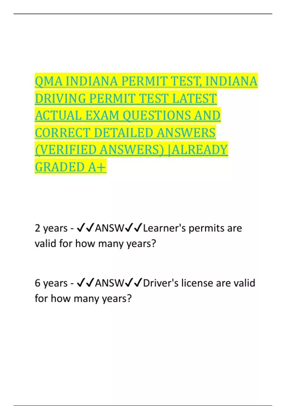 QMA INDIANA PERMIT TEST, INDIANA DRIVING PERMIT TEST LATEST ACTUAL EXAM QUESTIONS AND CORRECT DETAILED ANSWERS (VERIFIED ANSWERS) |ALREADY GRADED A+ 2 years - ANSWLearner's permits are valid for how many years? 6 years - ANSWDriver's license are valid for how many years?