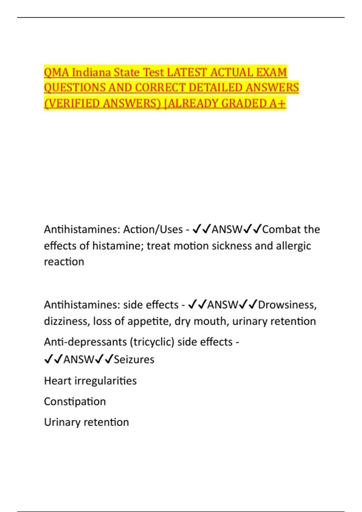 QMA Indiana State Test LATEST ACTUAL EXAM QUESTIONS AND CORRECT DETAILED ANSWERS (VERIFIED ANSWERS) |ALREADY GRADED A+ Antihistamines: Action/Uses - ANSWCombat the effects of histamine; treat motion sickness and allergic reaction