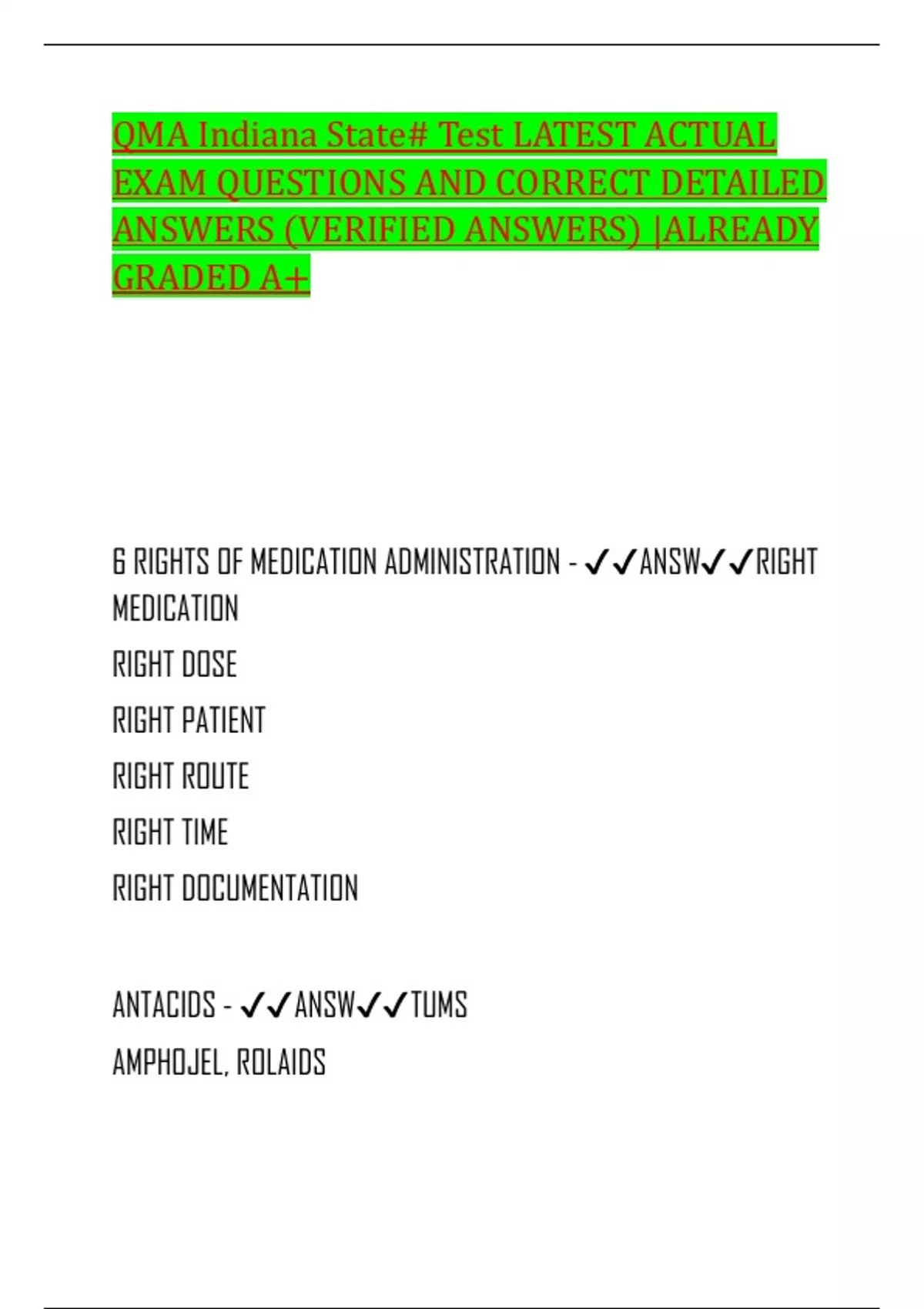 QMA Indiana State# Test LATEST ACTUAL EXAM QUESTIONS AND CORRECT DETAILED ANSWERS (VERIFIED ANSWERS) |ALREADY GRADED A+ 6 RIGHTS OF MEDICATION ADMINISTRATION - ANSWRIGHT MEDICATION RIGHT DOSE RIGHT PATIENT RIGHT ROUTE RIGHT TIME RIGHT DOCUMENTATI