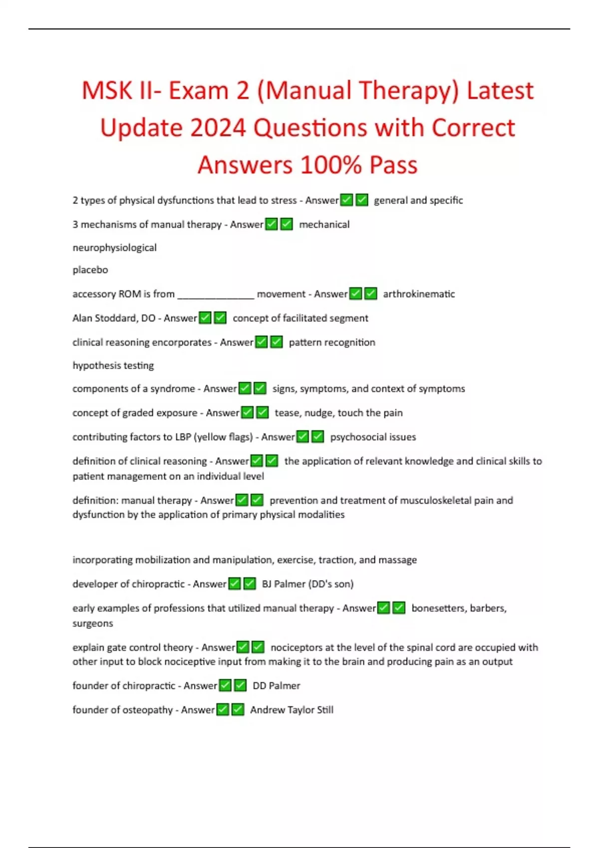 NSG6020- Final Exam Review Latest Update (2024) Comprehensive Questions with Correct Answers A 14-year-old boy who has been diagnosed with Osgood-Schlatter disease reports painful swelling just below the knee for the past 5 months. Which response by the nurse practitioner is appropriate? - Answer "Your disease is due to repeated stress on the patellar tendon. It is usually self limited, and your symptoms should resolve with rest." A 14-year-old girl is anxious about not having reached menarche. when taking the history, the nurse should ascertain which of the following? the age: - Answer She began to develop breasts A 15-year-old boy is seen in the clinic for complaints of "dull pain and pulling" in the scrotal area. On examination the nurse palpates a soft, irregular mass posterior to and above the testis on the left. This mass collapses when the patient is supine and refills when he is upright. This descriptions is consistent with: - Answer Varicocele A 16-year-old girl is being seen at clinic for gastrointestinal complaints and weight loss. Nurse determines that many of her complaints may be related to erratic eating patterns, eating predominantly fast foods, and high caffeine intake. In this situation, which is most appropriate when collecting current dietary intake information? - Answer Have the patient complete a food diary for 3 day= 2 weekdays + 2 weekend day. A 2 year old boy has been diagnosed with "physiologic cryptorchidiam" Given this diagnosis, during assessment the nurse will most likely observe: - Answer An absence of the testis in the scrotum, but the testis can be milked down A 40-year-old woman reports a change in mole size, accompanied by color changes, itching, burning, and bleeding over the past month. She has a dark complexion and has no family history of skin cancer, but she has had many blistering sunburns in the past. The nurse would: - Answer Refer the patient because of the suspicion of melanoma on the basis of her symptoms A 43-year-old woman is at the clinic for a routine examination. She reports that she has had a breast lump in her right breast for years. Recently, it has begun to change in consistency and is becoming harder. She reports that 5 years ago her physician evaluated the lump and determined that it "was nothing to worry about." the examination validates the presence of a mass in the right upper outer quadrant at 1 o'clock approximately 5 cm from the nipple. It is firm, mobile, non-tender, with borders that are not well defined. The nurse's recommendation to her is: - Answer Because of the change in consistency of the lump, it should be further evaluated by a physician.