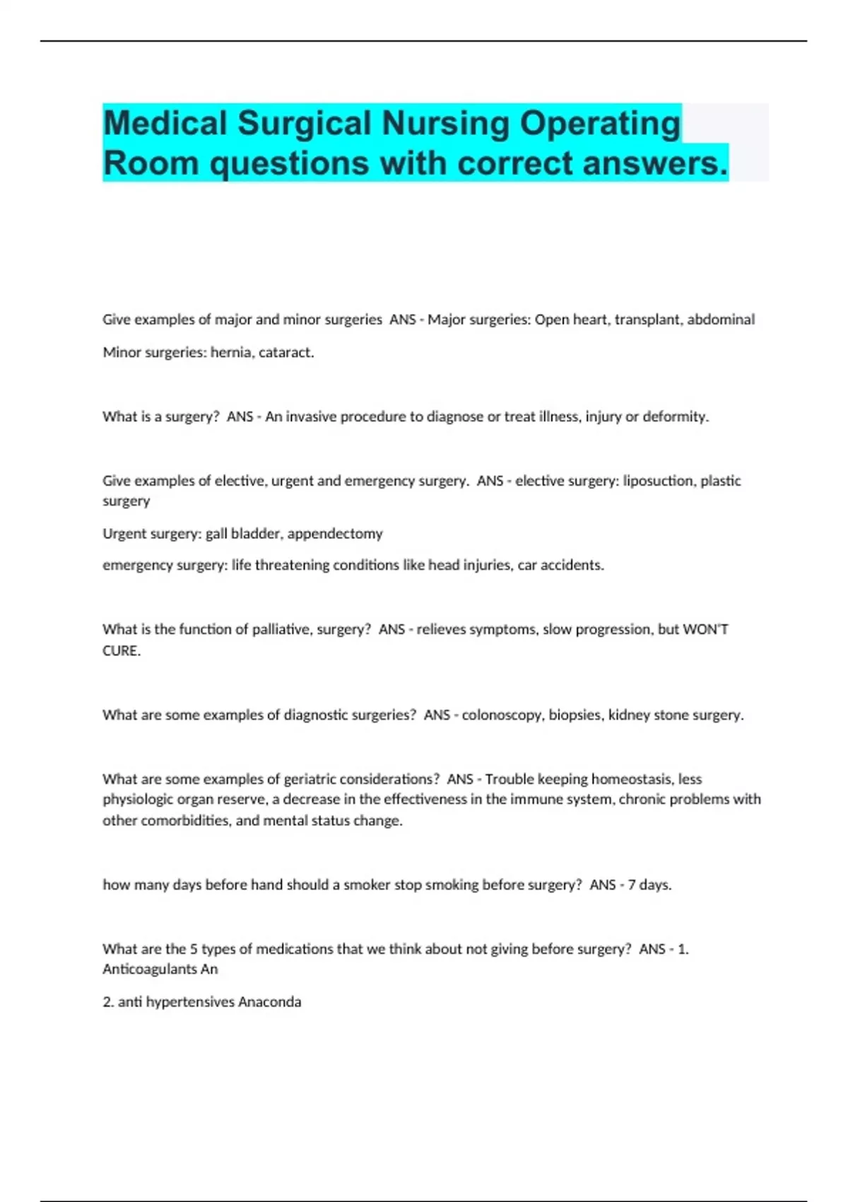 Medical Surgical Nursing Operating Room questions with correct answers.