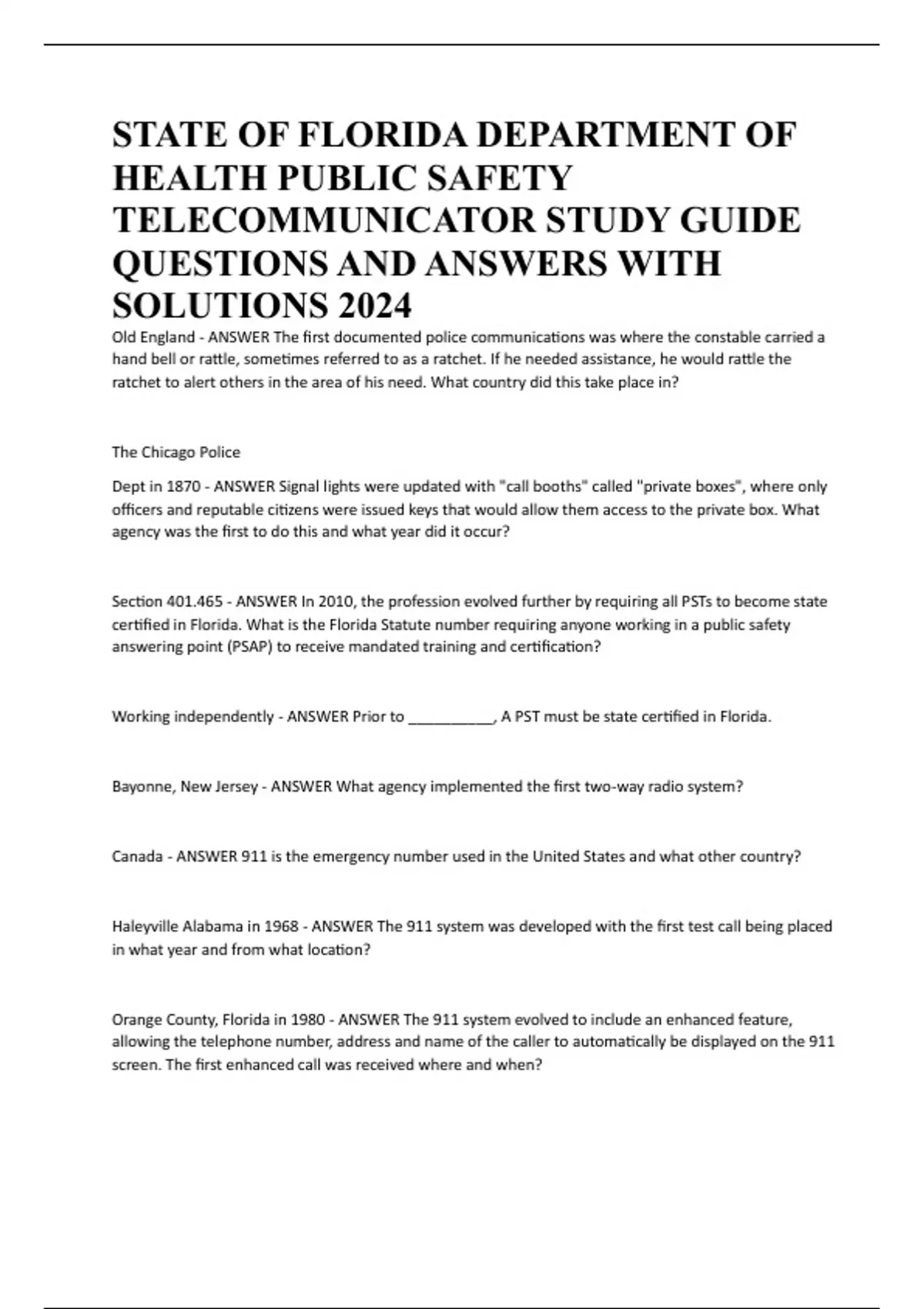 STATE OF FLORIDA DEPARTMENT OF HEALTH PUBLIC SAFETY TELECOMMUNICATOR STUDY GUIDE QUESTIONS AND ANSWERS WITH SOLUTIONS 2024