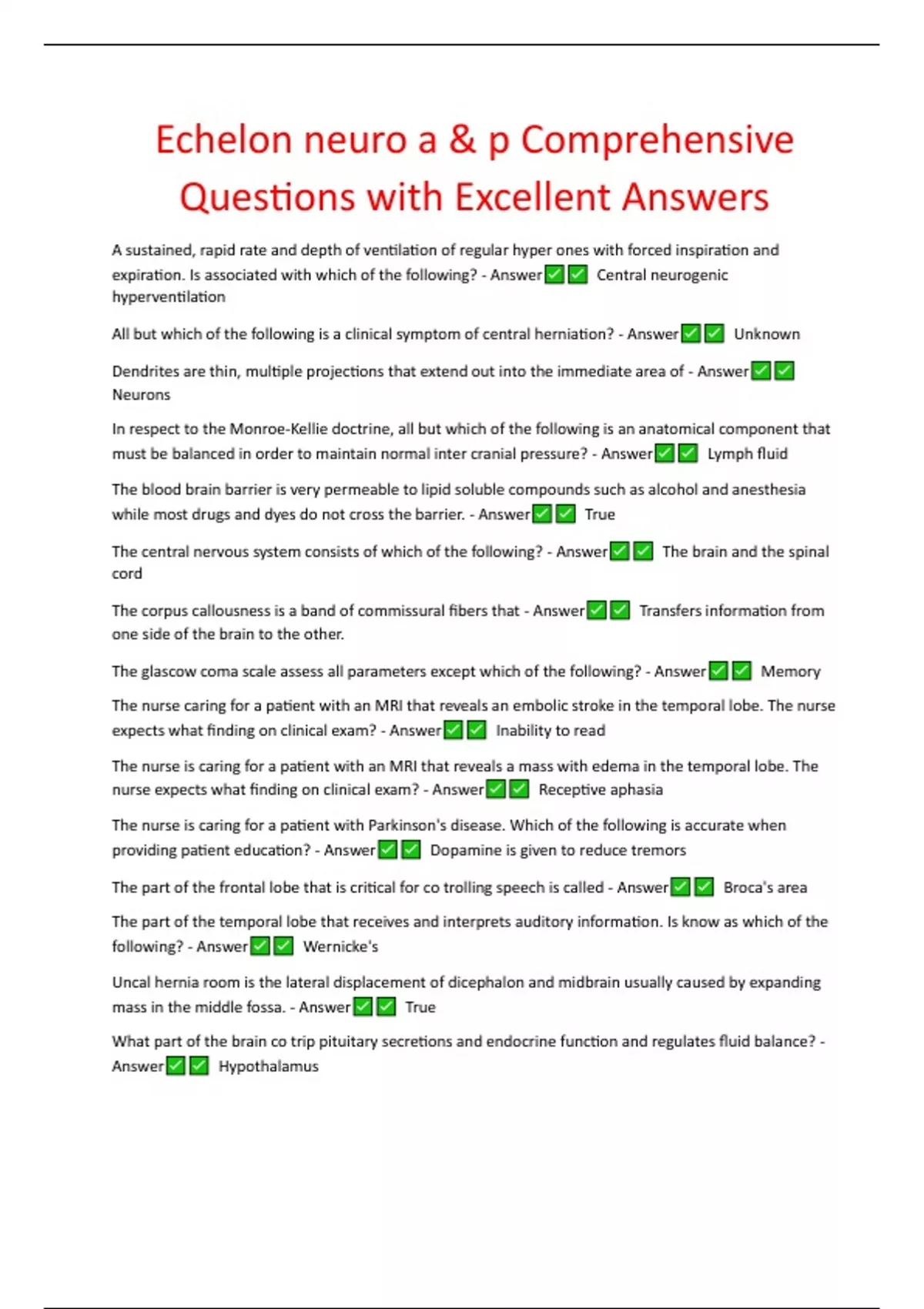 Echelon neuro a & p Comprehensive Questions with Excellent Answers A sustained, rapid rate and depth of ventilation of regular hyper ones with forced inspiration and expiration. Is associated with which of the following? - Answer Central neurogenic hyperventilation All but which of the following is a clinical symptom of central herniation? - Answer Unknown Dendrites are thin, multiple projections that extend out into the immediate area of - Answer Neurons In respect to the Monroe-Kellie doctrine, all but which of the following is an anatomical component that must be balanced in order to maintain normal inter cranial pressure? - Answer Lymph fluid The blood brain barrier is very permeable to lipid soluble compounds such as alcohol and anesthesia while most drugs and dyes do not cross the barrier. - Answer True The central nervous system consists of which of the following? - Answer The brain and the spinal cord The corpus callousness is a band of commissural fibers that - Answer Transfers information from one side of the brain to the other. The glascow coma scale assess all parameters except which of the following? - Answer Memory The nurse caring for a patient with an MRI that reveals an embolic stroke in the temporal lobe. The nurse expects what finding on clinical exam? - Answer Inability to read The nurse is caring for a patient with an MRI that reveals a mass with edema in the temporal lobe. The nurse expects what finding on clinical exam? - Answer Receptive aphasia