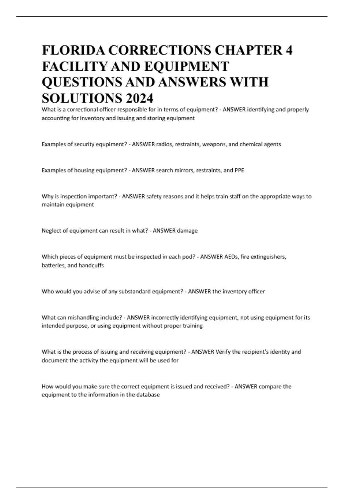 FLORIDA CORRECTIONS CHAPTER 4 FACILITY AND EQUIPMENT QUESTIONS AND ANSWERS WITH SOLUTIONS 2024
