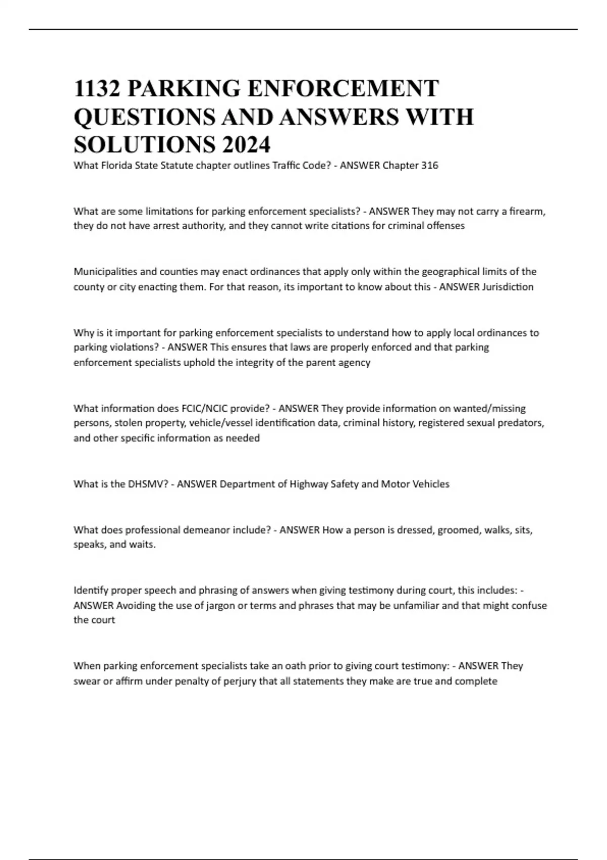 1132 PARKING ENFORCEMENT QUESTIONS AND ANSWERS WITH SOLUTIONS 2024