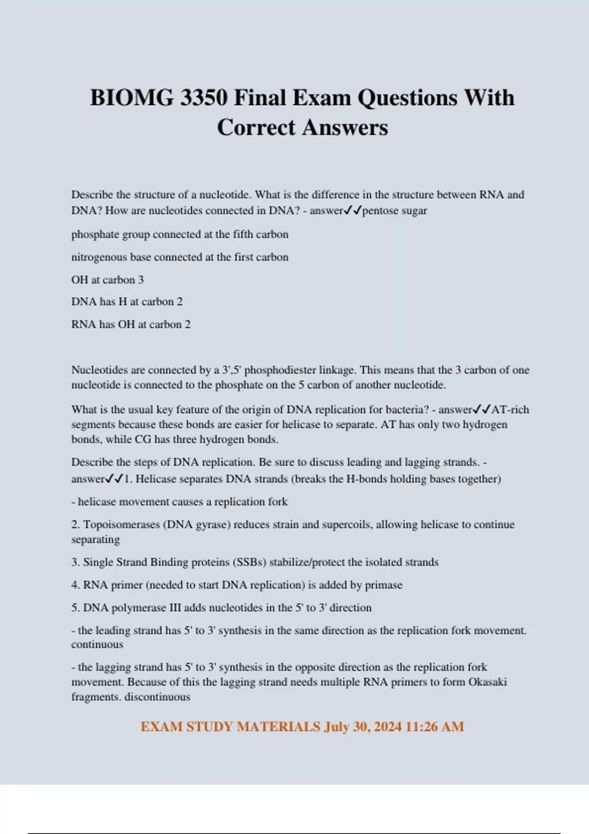 BIOMG 3350 Final Exam Questions With Correct Answers Describe the structure of a nucleotide. What is the difference in the structure between RNA and DNA? How are nucleotides connected in DNA? - answerpentose sugar phosphate group connected at the fifth carbon nitrogenous base connected at the first carbon OH at carbon 3 DNA has H at carbon 2 RNA has OH at carbon 2 Nucleotides are connected by a 3',5' phosphodiester linkage. This means that the 3 carbon of one nucleotide is connected to the phosphate on the 5 carbon of another nucleotide. What is the usual key feature of the origin of DNA replication for bacteria? - answerAT-rich segments because these bonds are easier for helicase to separate. AT has only two hydrogen bonds, while CG has three hydrogen bonds. Describe the steps of DNA replication. Be sure to discuss leading and lagging strands. - answer1. Helicase separates DNA strands (breaks the H-bonds holding bases together) - helicase movement causes a replication fork 2. Topoisomerases (DNA gyrase) reduces strain and supercoils, allowing helicase to continue separating 3. Single Strand Binding proteins (SSBs) stabilize/protect the isolated strands 4. RNA primer (needed to start DNA replication) is added by primase 5. DNA polymerase III adds nucleotides in the 5' to 3' direction - the leading strand has 5' to 3' synthesis in the same direction as the replication fork movement. continuous - the lagging strand has 5' to 3' synthesis in the opposite direction as the replication fork movement. Because of this the lagging strand needs multiple RNA primers to form Okasaki fragments. discontinuous EXAM STUDY MATERIALS July 30, 2024 11:26 AM 6. DNA polymerase I removes the RNA primer and replaces it with DNA 7. DNA ligase seals the nicks after the RNA primer is replaced with DNA What are the purines and pyrimidines? What's the difference? - answerpyrimidines - thymine, cytosine, uracil purines - adenine, guanine pyrimidines are 1 six carbon ring structures. purines are 2 ring structures (1 six carbon, 1 five carbon) DNA can be highly distorted during replication/transcription, but is resolved by this enzyme - answertopoisomerase What are important structural components of chromosomes? - answercentromere = a DNA sequence that functions during cell division as an attachment point for proteins that link the chromosome to the mitotic spindle telomeres = sequences at the ends of eukaryotic chromosomes that help stabilize the chromosome (highly repetitive sequences associated with these) gene = a segment of a DNA molecule that containsthe information required for the synthesis of afunctional biological product, whether protein orRNA Why don't bacterial cells have telomeres? - answerBacterial cells are circular, while eukaryotic cells have exposed ends (and thus need to be protected by these sequences). introns and exons - answerIn most eukaryotic genes, coding regions (exons) are interrupted by noncoding regions (introns). During transcription, the entire gene is copied into a pre-mRNA, which includes exons and introns. During the process of RNA splicing, introns are removed and exons joined to form a contiguous coding sequence. ~99% of human genome does not code for genes what are the functions of the four classes of RNA? - answerseveral classes of RNA: - ribosomal RNAs (rRNAs) = components of ribosomes - messenger RNAs (mRNAs) = intermediates in protein synthesis - transfer RNAs (tRNAs) = adapter molecules that translate the information in mRNA into a specific amino acid sequence - noncoding RNAs (ncRNAs) = wide variety of functions EXAM STUDY MATERIALS July 30, 2024 11:26 AM Why is RNA less stable than DNA? - answerIt has an extra Hydroxyl Group (OH) on the 2' carbon making it more likely to participate in chemical reactions The proximity of the OH group to the phosphodiester bond means that the H may react with the phosphate group, causing the bond between two nucleotides to break How in DNA denatured? Can this be fixed? - answerdenaturation, or melting, of the double helix:- due to pH extremes or high temperatures (useful in experiments) - disrupts hydrogen bonds and base-stacking interactions Yes, can be fixed. anneal = process by which two strands spontaneously rewind when temperature or pH is returned to its normal range- two-step process What are the adenine nucleotides? - answerNucleotides Carry Chemical Energy in Cells hydrolysis of nucleoside triphosphates provides chemical energy- ATP is the most widely used. ADP also cAMP are is another nucleotide that is a secondary messenger Describe the structure of the strand (macro-level structure) of DNA and RNA - answerDNA is primarily a right-handed two-stranded helix (secondary structure),whereas RNA has lots of secondary and tertiary structure (interactionsbeyond just a helix) but is a single strand. Describe DNA repair (proofreading, mismatch, and damage) - answerDNA is degraded by nucleases. exonuclease = enzyme that can remove nucleotides from the strand starting from one end of the strand. endonuclease = enzyme that can remove nucleotides from the middle of the strand Proofread: During DNA synthesis, most DNA polymerases "check their work," fixing the majority of mispaired bases in a process called proofreading. DNA pol I and DNA pol III have 3' to 5' exonuclease capabilities. This allows them to proofread and remove incorrectly matching nucleotides and replace them right away. Mismatch repair: Immediately after DNA synthesis, any remaining mispaired bases can be detected and replaced in a process called mismatch repair. First, a protein complex (group of proteins) recognizes and binds to the mispaired base. A second complex cuts the DNA near the