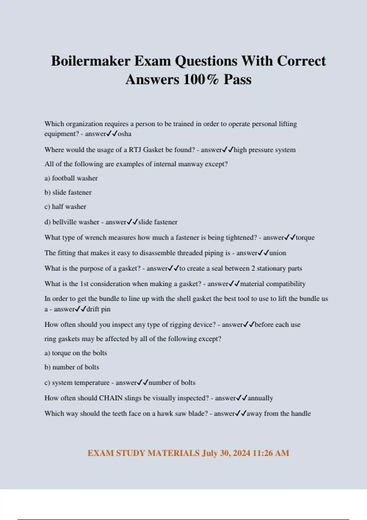 Boilermaker Exam Questions With Correct Answers 100% Pass Which organization requires a person to be trained in order to operate personal lifting equipment? - answerosha Where would the usage of a RTJ Gasket be found? - answerhigh pressure system All of the following are examples of internal manway except? a) football washer b) slide fastener c) half washer d) bellville washer - answerslide fastener What type of wrench measures how much a fastener is being tightened? - answertorque The fitting that makes it easy to disassemble threaded piping is - answerunion What is the purpose of a gasket? - answerto create a seal between 2 stationary parts What is the 1st consideration when making a gasket? - answermaterial compatibility In order to get the bundle to line up with the shell gasket the best tool to use to lift the bundle us a - answerdrift pin How often should you inspect any type of rigging device? - answerbefore each use ring gaskets may be affected by all of the following except? a) torque on the bolts b) number of bolts c) system temperature - answernumber of bolts How often should CHAIN slings be visually inspected? - answerannually Which way should the teeth face on a hawk saw blade? - answeraway from the handle