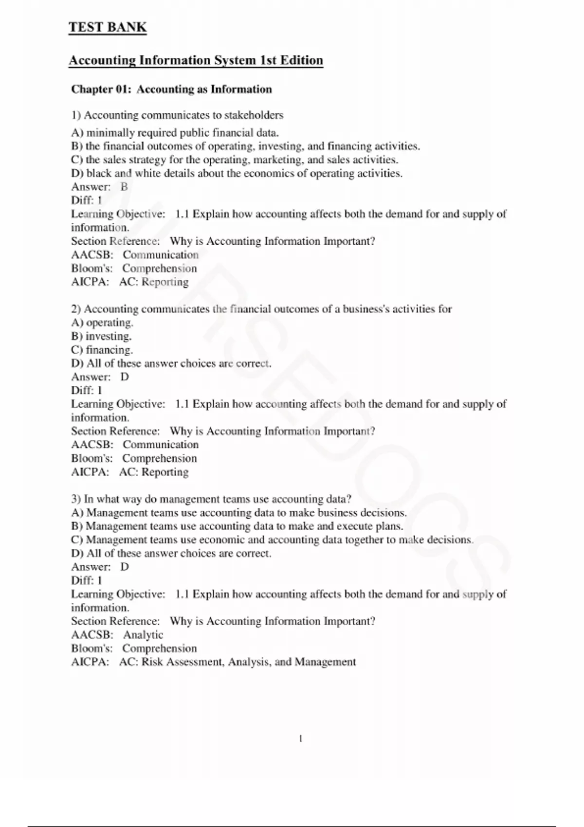 Test Bank for Accounting Information Systems: Connecting Careers, Systems, and Analytics, 1st Edition 1e by Arline A. Savage, Danielle Brannock, Alicja Foksinska. Full Chapters test bank are included - Chapter 1 to 19 1 Accounting as Information 1.1 Why Is Accounting Information Important? 1-2 1.2 How Have Accounting Information Systems Evolved? 1-12 1.3 How Does Management Use Information? 1-18 1.4 What Is the Relationship Between Accounting and Data Analytics? 1-23 2 Risks and Risk Assessments 2.1 How Do We Understand Risk? 2-2 2.2 What Are the Types of Risks? 2-7 2.3 How Do We Prioritize Risk? 2-13 2.4 How Do We Respond to Risk? 2-18 3 Risk Management and Internal Controls 3.1 How Do Internal Controls Mitigate Risk? 3-2 3.2 How Are Controls Classified? 3-8 3.3 How Do We Assess Internal Controls? 3-16 3.4 Why Are Internal Control Frameworks Important? 3-21 4 Software and Systems 4.1 How Do Systems Capture and Process Data? 4-2 4.2 How Do Startups and Small Businesses Use Technology? 4-10 4.3 What Are the Characteristics of Information Systems for Growing Companies? 4-15 4.4 Why Are Enterprise Resource Planning (ERP) Systems Considered Ideal? 4-22 5 Data Storage and Analysis 5.1 What Is Data? 5-2 5.2 How Is Data Stored? 5-8 5.3 What Makes Data “Big Data”? 5-11 5.4 How Do Accounting Professionals Use Data? 5-15 6 Designing Systems and Databases 6.1 How Are Systems Developed? 6-2 6.2 Which Methodology Should Be Used? 6-9 6.3 What Type of Database Should Be Used? 6-15 6.4 How Are Relational Databases Designed? 6-20 6.5 How Do We Interact with Data in a Database? 6-29 7 Emerging and Disruptive Technologies 7.1 How Do Companies Approach Emerging and Disruptive Technologies? 7-2 7.2 How Do Disruptive Technologies Provide Business Opportunities? 7-7 7.3 How Does Robotic Process Automation (RPA) Benefit Accounting Professionals? 7-12 7.4 What Is Blockchain? 7-23 7.5 Why Should Accountants Care About Blockchain? 7-30 8 Documenting Systems and Processes 8.1 Why Do We Document Systems and 8.2 How Do We Know Which Type of Documentation to Use? 8-6 8.3 How Do Flowcharts Illustrate Systems or Business Processes? 8-12 8.4 How Do Data Flow Diagrams Show Information Flow? 8-19 Part II: Business Processes 9 Human Resources and Payroll Processes 9.1 How Are Human Resources and Payroll Related? 9-2 9.2 How Are New Employees Hired? 9-6 9.3 What Happens When an Employee Is Terminated? 9-13 9.4 How Do We Compensate Employees for Their Work? 9-19 9.5 How Can Human Resources and Payroll Data Be Used to Identify Risks? 9-28 10 Purchasing and Payments Processes 10.1 What Is the Relationship Between Purchasing, Inventory Management, and Supply Chain Management? 10-2 10.2 How Are Inventory and Other Goods and Services Purchased? 10-9 10.3 What Makes Fixed Assets Unique to Purchasing and Payments? 10-17 10.4 How Do We Evaluate the Credit Payments Process? 10-24 10.5 How Does the AIS Capture Purchasing and Payments Data? 10-28 11 Conversion Processes 11.1 What Is the Relationship Between Conversion Processes, Inventory, and Supply Chain Management? 11-2 11.2 Why Is Cost Accounting Important to the Accounting Information System? 11-14 11.3 What Is Digital Manufacturing? 11-22 11.4 How Is Data Collected and Used? 11-26 14.5 How Do We Make Changes to Systems? 14-27 12 Marketing, Sales, and Collections Processes 12.1 How Do Marketing, Sales, and Collections Complete the Business Model? 12-2 12.2 Why Are Business Credit Sales More Complex Than Consumer Cash Sales? 12-12 12.3 How Do We Ensure That Revenue Is Correctly Recognized? 12-24 12.4 How Are Customer Payments Collected? 12-29 12.5 Which Reports and Analytics Give Insights into These Processes? 12-36 13 Financial Reporting Processes 13.1 How Is an AIS Involved in Financial Reporting? 13-2 13.2 How Are Financial Statements Generated by an AIS? 13-6 13.3 How Does XBRL Create Efficient Financial Reporting? 13-16 13.4 Are There Other Important Financial Accounting Reports? 13-20 13.5 How Is Financial Reporting Data Used for Insights and Decision Making? 13-25 Part III: Risk Assurance 14 Information Systems and Controls 14.1 What Framework Can We Use to Mitigate Risk Around Our Systems? 14-2 14.2 How Do We Decide Who Can Access Systems? 14-6 14.3 How Do We Physically Protect Our Systems? 14-13 14.4 How Do We Keep Our Systems Running? 14-18 15 Fraud 15.1 What Is Fraud? 15-2 15.2 How Do We Manage Fraud Risk? 15-8 15.3 How Does Asset Misappropriation Result in Fraud? 15-14 15.4 What Are the Characteristics of Financial Statement Fraud? 15-22 16 Cybersecurity 16.1 How Is Cybersecurity Relevant to the Accounting Profession? 16-2 16.2 How Do Cybercriminals Plan Attacks? 16-8 16.3 How Do Hackers Gain Unauthorized Access? 16-15 16.4 How Do Attackers Shut Down a System? 16-21 Part IV: Technology and Analytics 17 Data Analytics 17.1 How Is Data Analytics Changing the Accounting Profession? 17-2 17.2 How Do We Explore a Data Set? 17-7 17.3 How Do We Investigate Interesting Occurrences in a Data Set? 17-13 17.4 Which Analytics Techniques Are Gaining Popularity in the Accounting Profession? 17-18 18 Data Visualization 18.1 How Does Visualization Tell a Story with Data? 18-2 18.2 What Are the Fundamentals of Design? 18-7 18.3 How Do Visualizations Help Us Explore Data? 18-13 18.4 When Should Explanatory Visualizations Be Used for Storytelling? 18-25 GLOSSARY G-1 INDEX I-1 Online Chapter 19 Audit Assurance 19.1 What Is the Difference Between Internal Audit and External Audit? 19-2 19.2 How Are Internal Audits Performed? 19-8 19.3 How Is Testing Performed? 19-13 19.4 What Happens After an Audit? 19-21