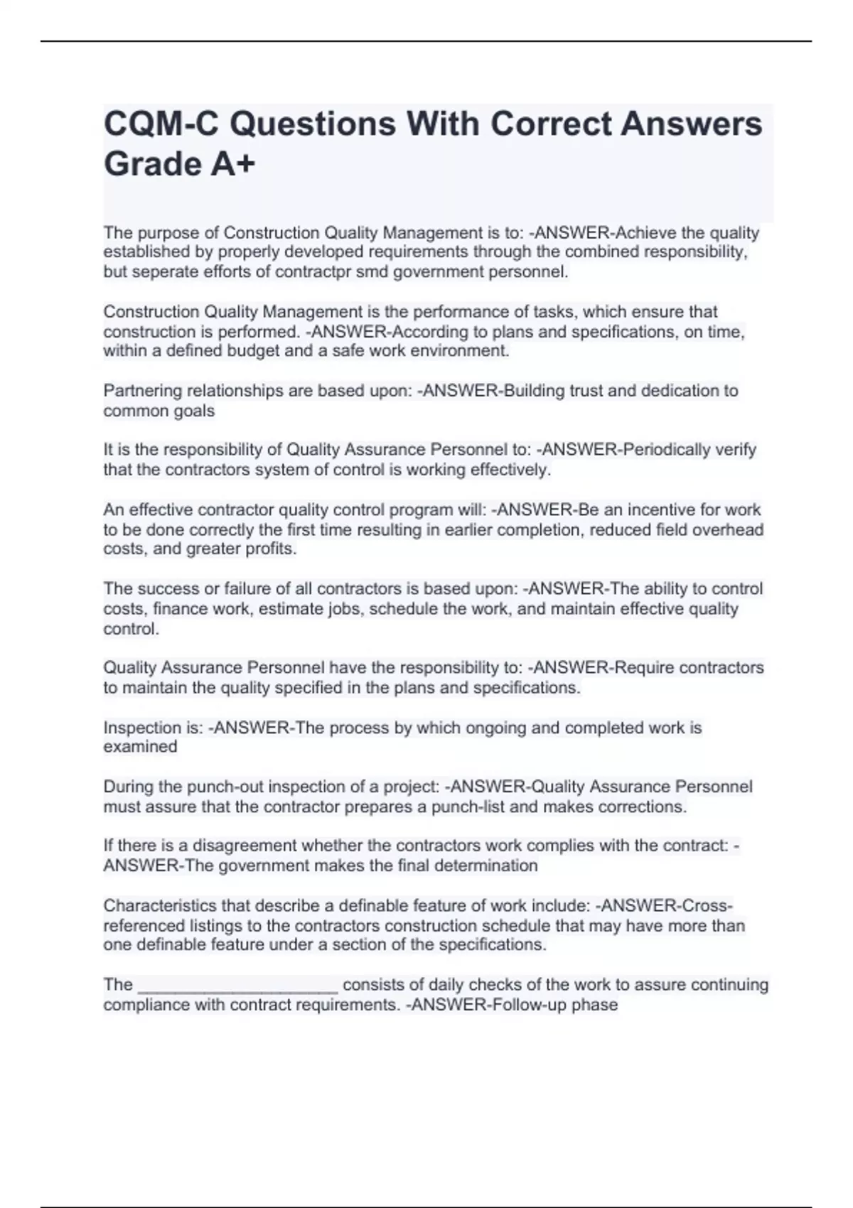 The purpose of Construction Quality Management is to: -ANSWER-Achieve the quality established by properly developed requirements through the combined responsibility, but seperate efforts of contractpr smd government personnel. Construction Quality Management is the performance of tasks, which ensure that construction is performed. -ANSWER-According to plans and specifications, on time, within a defined budget and a safe work environment. Partnering relationships are based upon: -ANSWER-Building trust and dedication to common goals It is the responsibility of Quality Assurance Personnel to: -ANSWER-Periodically verify that the contractors system of control is working effectively. An effective contractor quality control program will: -ANSWER-Be an incentive for work to be done correctly the first time resulting in earlier completion, reduced field overhead costs, and greater profits. The success or failure of all contractors is based upon: -ANSWER-The ability to control costs, finance work, estimate jobs, schedule the work, and maintain effective quality control. Quality Assurance Personnel have the responsibility to: -ANSWER-Require contractors to maintain the quality specified in the plans and specifications. Inspection is: -ANSWER-The process by which ongoing and completed work is examined During the punch-out inspection of a project: -ANSWER-Quality Assurance Personnel must assure that the contractor prepares a punch-list and makes corrections. If there is a disagreement whether the contractors work complies with the contract: -ANSWER-The government makes the final determination Characteristics that describe a definable feature of work include: -ANSWER-Cross-referenced listings to the contractors construction schedule that may have more than one definable feature under a section of the specifications. The _____________________ consists of daily checks of the work to assure continuing compliance with contract requirements. -ANSWER-Follow-up phase