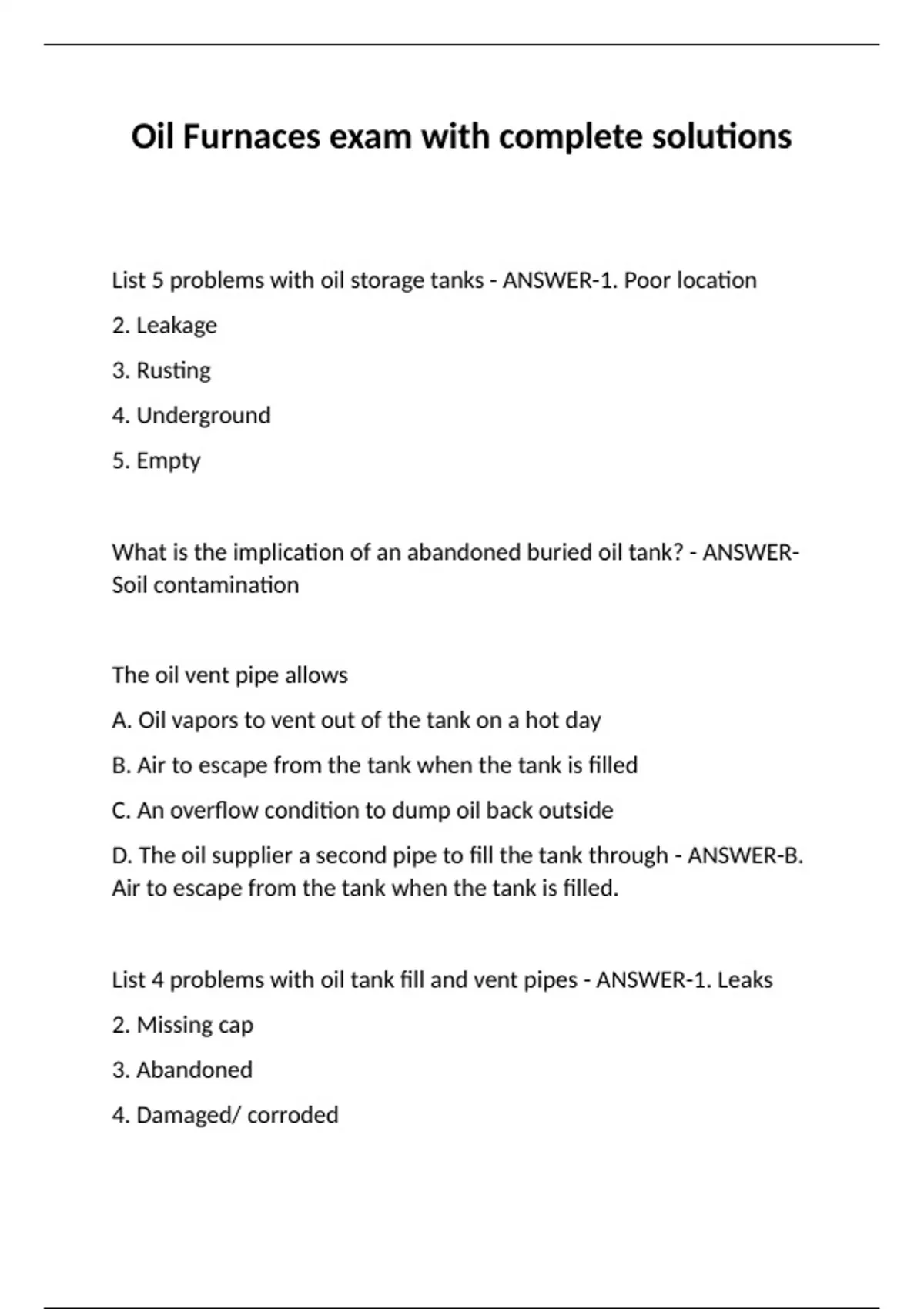 List 5 problems with oil storage tanks 1. Poor location 2. Leakage 3. Rusting 4. Underground 5. Empty What is the implication of an abandoned buried oil tank? Soil contamination The oil vent pipe allows A. Oil vapors to vent out of the tank on a hot day B. Air to escape from the tank when the tank is filled C. An overflow condition to dump oil back outside D. The oil supplier a second pipe to fill the tank through B. Air to escape from the tank when the tank is filled. List 4 problems with oil tank fill and vent pipes 1. Leaks 2. Missing cap 3. Abandoned 4. Damaged/ corroded List 4 problems with oil supply lines 1. Leaks 2. Corrosion/ mechanical damage 3. Unprotected 4. Undersized Explain why an exterior, above ground oil storage tank needs a 2" oil supply line, rather than the typical 3/8" line. The large pipe allows the oil to flow through the line when the temperature is very low. Oil becomes very viscous at low temperatures. List 3 problems with oil filters 1. Leaking 2. Dirty 3. Missing Natural gas burners on conventional furnaces are natural draft. Oil burners in conventional oil furnaces are _____ draft. Forced Since oil is a liquid, we have to _____ it before we can ignite it. Atomize List 6 common problems with oil burners 1. Dirty 2. Inoperative 3. Leaking 4. Incomplete combustion 5. Vibrating/ noisy 6. Too close to combustibles What is the typical required combustible clearance between an oil burner and combustibles? 24"