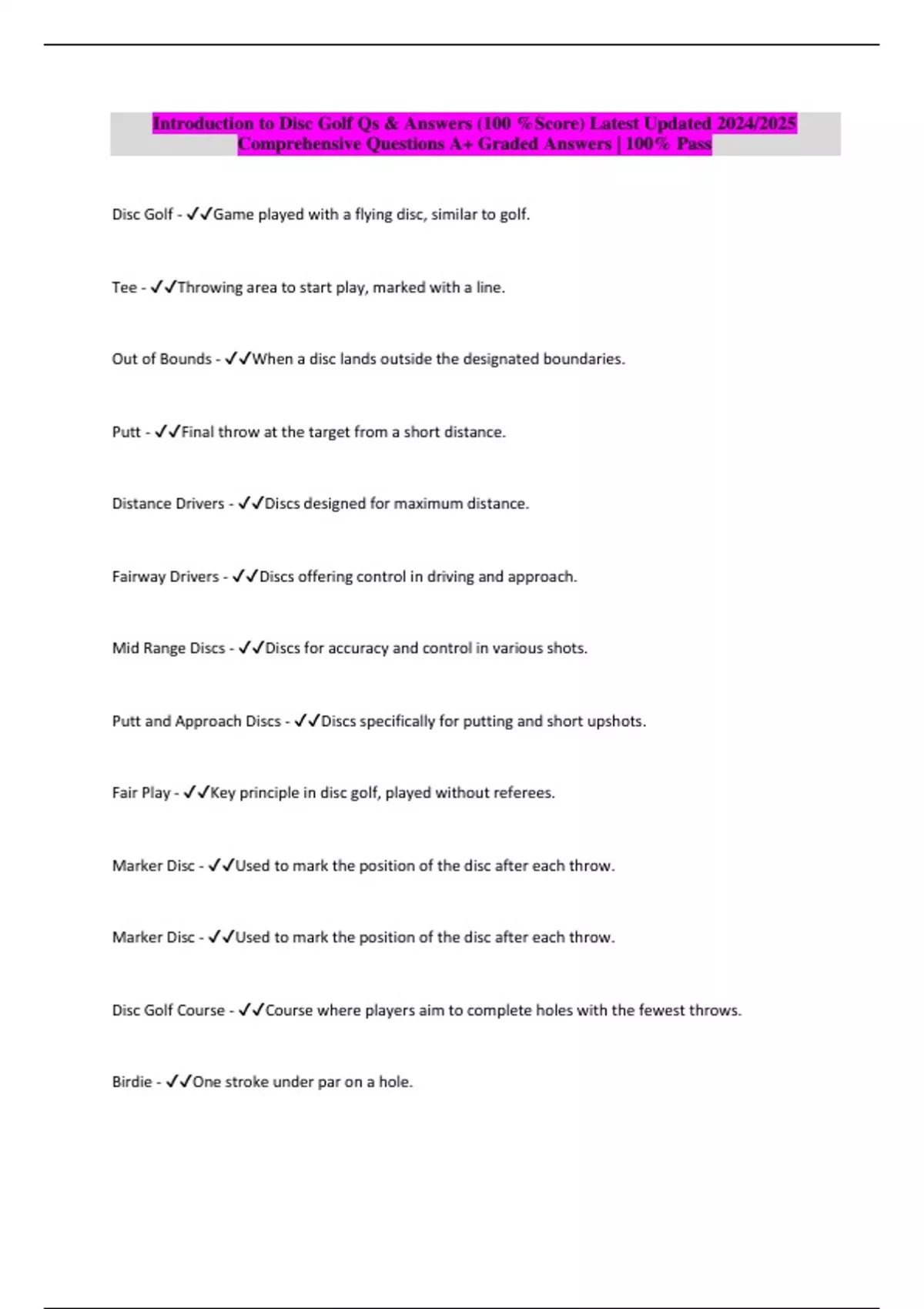Package deal::: DISC GOLF Exams Qs & Answers (100 %Score) Latest updated 2024/2025 Comprehensive Questions A+ Graded Answers | 100% Pass