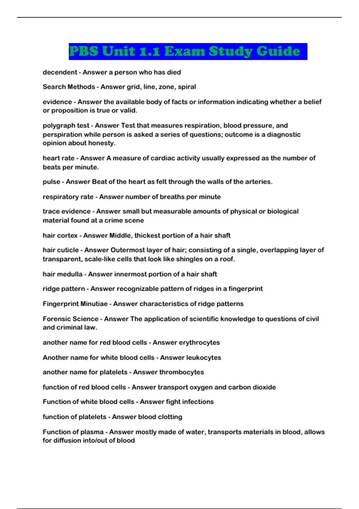 PBS Unit 1.1 Exam Study Guide decendent - Answer a person who has died Search Methods - Answer grid, line, zone, spiral evidence - Answer the available body of facts or information indi cating whether a belief or proposition is true or valid. polygraph test - Answer Test that measures respiration, blood p ressure, and perspiration while person is asked a series of questions; outcome i s a diagnostic opinion about honesty. heart rate - Answer A measure of cardiac activity usually express ed as the number of beats per minute. pulse - Answer Beat of the heart as felt through the walls of the a rteries. respiratory rate - Answer number of breaths per minute trace evidence - Answer small but measurable amounts of physical or biological material found at a crime scene hair cortex - Answer Middle, thickest portion of a hair shaft hair cuticle - Answer Outermost layer of hair; consisting of a singl e, overlapping layer of transparent, scale-like cells that look like shingles on a roof. hair medulla - Answer innermost portion of a hair shaft ridge pattern - Answer recognizable pattern of ridges in a fin gerprint Fingerprint Minutiae - Answer characteristics of ridge patterns Forensic Science - Answer The application of scientific knowled ge to questions of civil and criminal law. another name for red blood cells - Answer erythrocytes Another name for white blood cells - Answer leukocytes another name for platelets - Answer thrombocytes function of red blood cells - Answer transport oxygen and carbon dioxide Function of white blood cells - Answer fight infections function of platelets - Answer blood clotting Function of plasma - Answer mostly made of water, transports mat erials in blood, allows for diffusion into/out of blood
