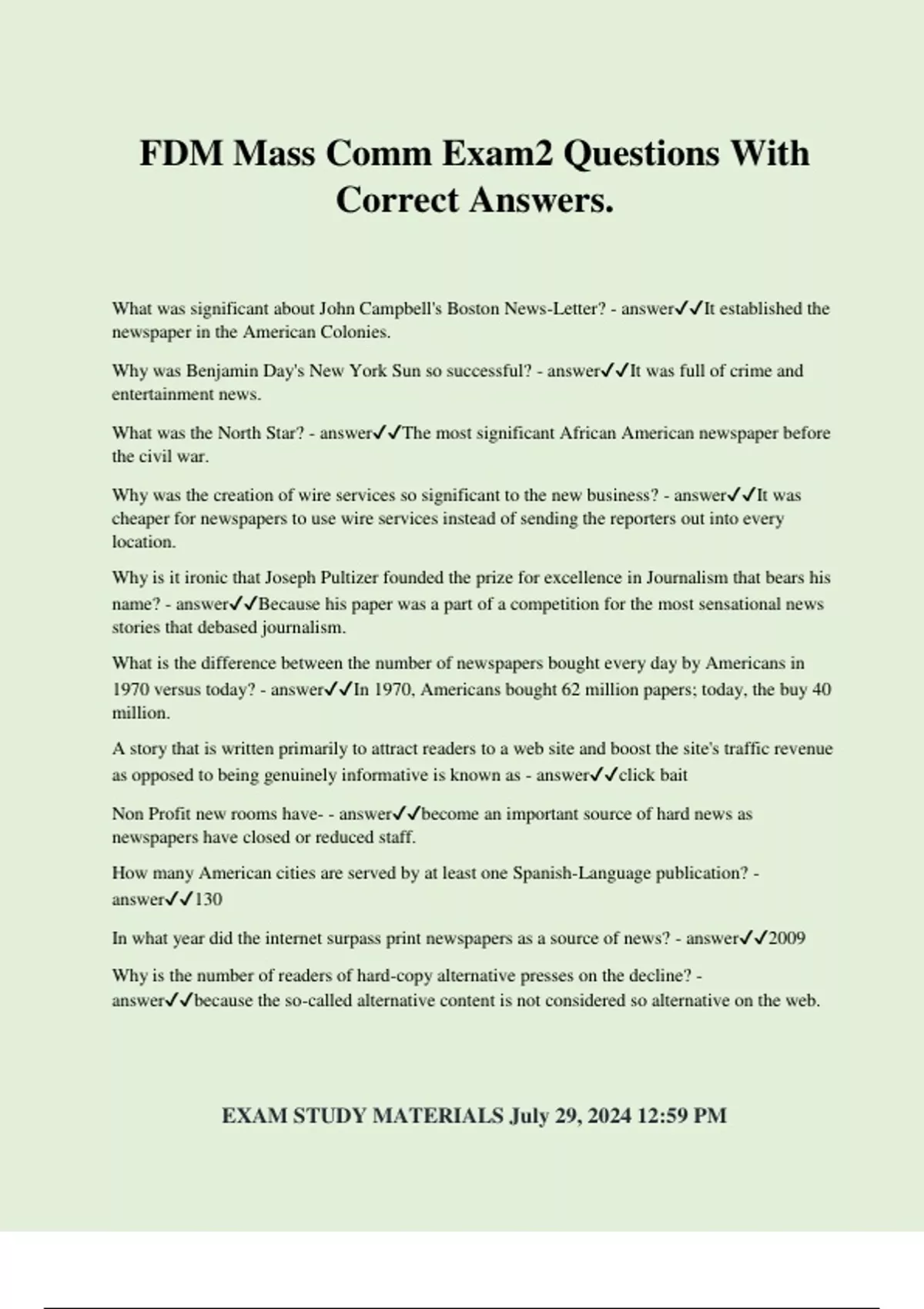 FDM Mass Comm Exam2 Questions With Correct Answers. What was significant about John Campbell's Boston News-Letter? - answerIt established the newspaper in the American Colonies. Why was Benjamin Day's New York Sun so successful? - answerIt was full of crime and entertainment news. What was the North Star? - answerThe most significant African American newspaper before the civil war. Why was the creation of wire services so significant to the new business? - answerIt was cheaper for newspapers to use wire services instead of sending the reporters out into every location. Why is it ironic that Joseph Pultizer founded the prize for excellence in Journalism that bears his name? - answerBecause his paper was a part of a competition for the most sensational news stories that debased journalism. What is the difference between the number of newspapers bought every day by Americans in 1970 versus today? - answerIn 1970, Americans bought 62 million papers; today, the buy 40 million. A story that is written primarily to attract readers to a web site and boost the site's traffic revenue as opposed to being genuinely informative is known as - answerclick bait Non Profit new rooms have- - answerbecome an important source of hard news as newspapers have closed or reduced staff. How many American cities are served by at least one Spanish-Language publication? - answer130 In what year did the internet surpass print newspapers as a source of news? - answer2009 Why is the number of readers of hard-copy alternative presses on the decline? - answerbecause the so-called alternative content is not considered so alternative on the web. EXAM STUDY MATERIALS July 29, 2024 12:59 PM What is one reason so many advertisers choose newspapers to buy ad space? - answerBecause newspapers tend to have the kind of readers that advertisers covet as an audience. What is the main argument for joint operating agreements for newspapers? - answerIf cities only have a single newspaper, there are no conflicting opinions to add diversity to the news. Roughly what percentage of Americans between the ages of 18 and 34 read a print or online newspaper daily? - answer29% Where are the most important stories placed on the front page of newspapers? - answerAbove the fold and to the left In addition to technology, what is the principal factor contributing to the changes that newspapers face? - answerThe readers In what ways are newspapers lowering the barrier between writing and advertising? - answer1) To make more money, papers are asking writers to promote products instead of news. 2) Some news departments answer to sales managers rather than editors. What is a fundamental problem in readership faced by newspapers in the United States? - answerThe age group in the United States that most reads newspapers becomes smaller each year. Why are newspapers financially burdened by adding a free internet edition when it is produced so inexpensively? - answer1) Readers stop buying print editions when they can get free online subscriptions. 2) Newspapers still need to print costly paper editions. During American colonial times, a broadside was - answerA single-sheet announcement or account of events from England. What were major effects that the penny press had on the field of journalism? - answer1) Newspaper companies generated new income based on their advertising potential. 2) Newspapers became less concerned about business news and more about local news. 3) Newspaper coverage began to be designed to appeal to the masses. The New York Morning Herald debuted the __________________ system to ensure getting the best stories from around the country and the world. - answerCorrespondent What was true concerning the outcome of the Zenger trial? - answer1) Zenger went free because his lawyer argued for something to be consid