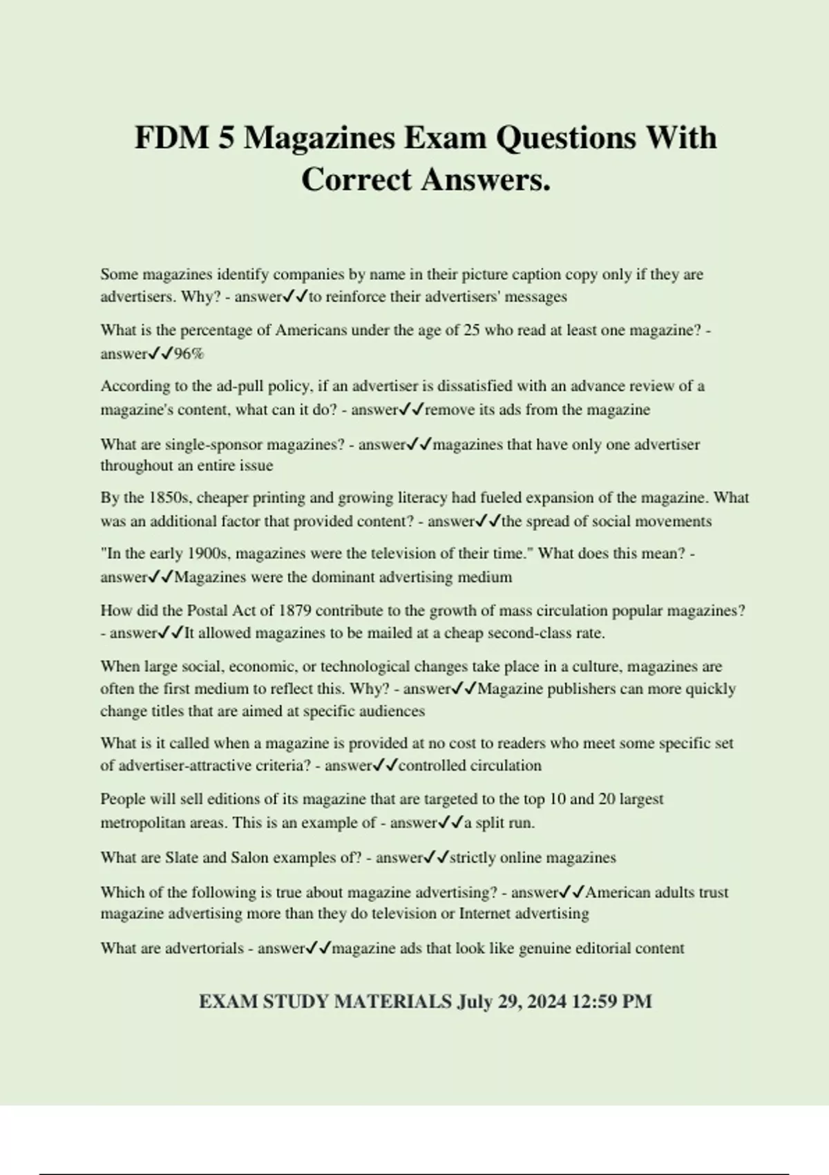 FDM 5 Magazines Exam Questions With Correct Answers. Some magazines identify companies by name in their picture caption copy only if they are advertisers. Why? - answerto reinforce their advertisers' messages What is the percentage of Americans under the age of 25 who read at least one magazine? - answer96% According to the ad-pull policy, if an advertiser is dissatisfied with an advance review of a magazine's content, what can it do? - answerremove its ads from the magazine What are single-sponsor magazines? - answermagazines that have only one advertiser throughout an entire issue By the 1850s, cheaper printing and growing literacy had fueled expansion of the magazine. What was an additional factor that provided content? - answerthe spread of social movements "In the early 1900s, magazines were the television of their time." What does this mean? - answerMagazines were the dominant advertising medium How did the Postal Act of 1879 contribute to the growth of mass circulation popular magazines? - answerIt allowed magazines to be mailed at a cheap second-class rate. When large social, economic, or technological changes take place in a culture, magazines are often the first medium to reflect this. Why? - answerMagazine publishers can more quickly change titles that are aimed at specific audiences What is it called when a magazine is provided at no cost to readers who meet some specific set of advertiser-attractive criteria? - answercontrolled circulation People will sell editions of its magazine that are targeted to the top 10 and 20 largest metropolitan areas. This is an example of - answera split run. What are Slate and Salon examples of? - answerstrictly online magazines Which of the following is true about magazine advertising? - answerAmerican adults trust magazine advertising more than they do television or Internet advertising What are advertorials - answermagazine a