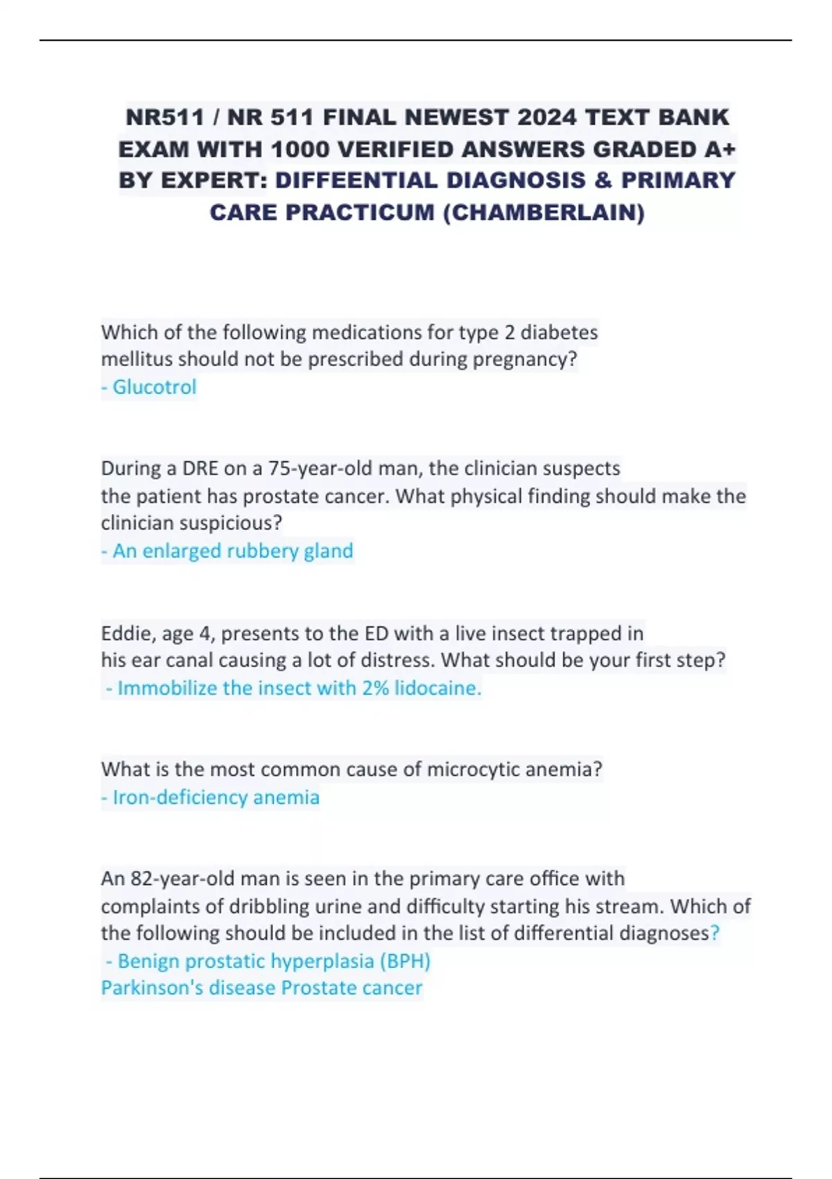 NR511 / NR 511 FINAL NEWEST 2024 TEXT BANK EXAM WITH 1000 VERIFIED ANSWERS GRADED A+ BY EXPERT: DIFFEENTIAL DIAGNOSIS & PRIMARY CARE PRACTICUM (CHAMBERLAIN)