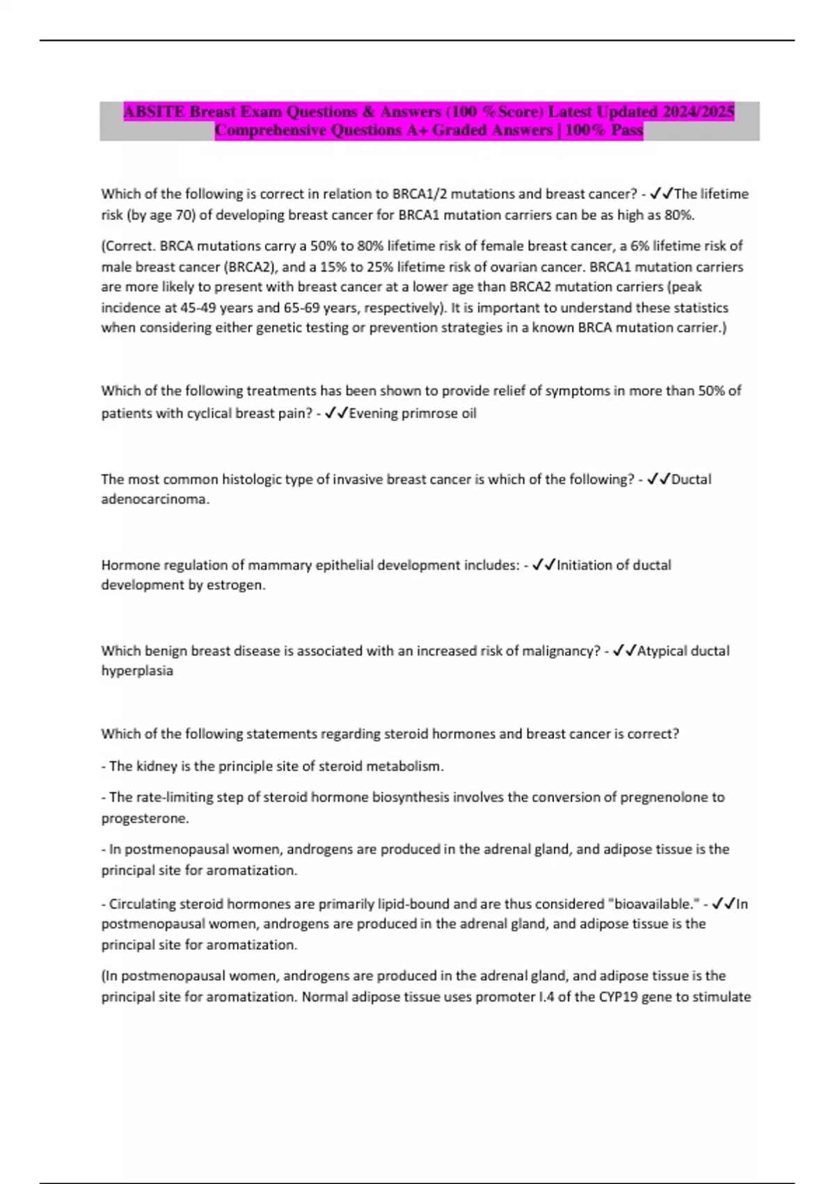 ABSITE Breast Exam Questions & Answers (100 %Score) Latest Updated 2024/2025 Comprehensive Questions A+ Graded Answers | 100% Pass