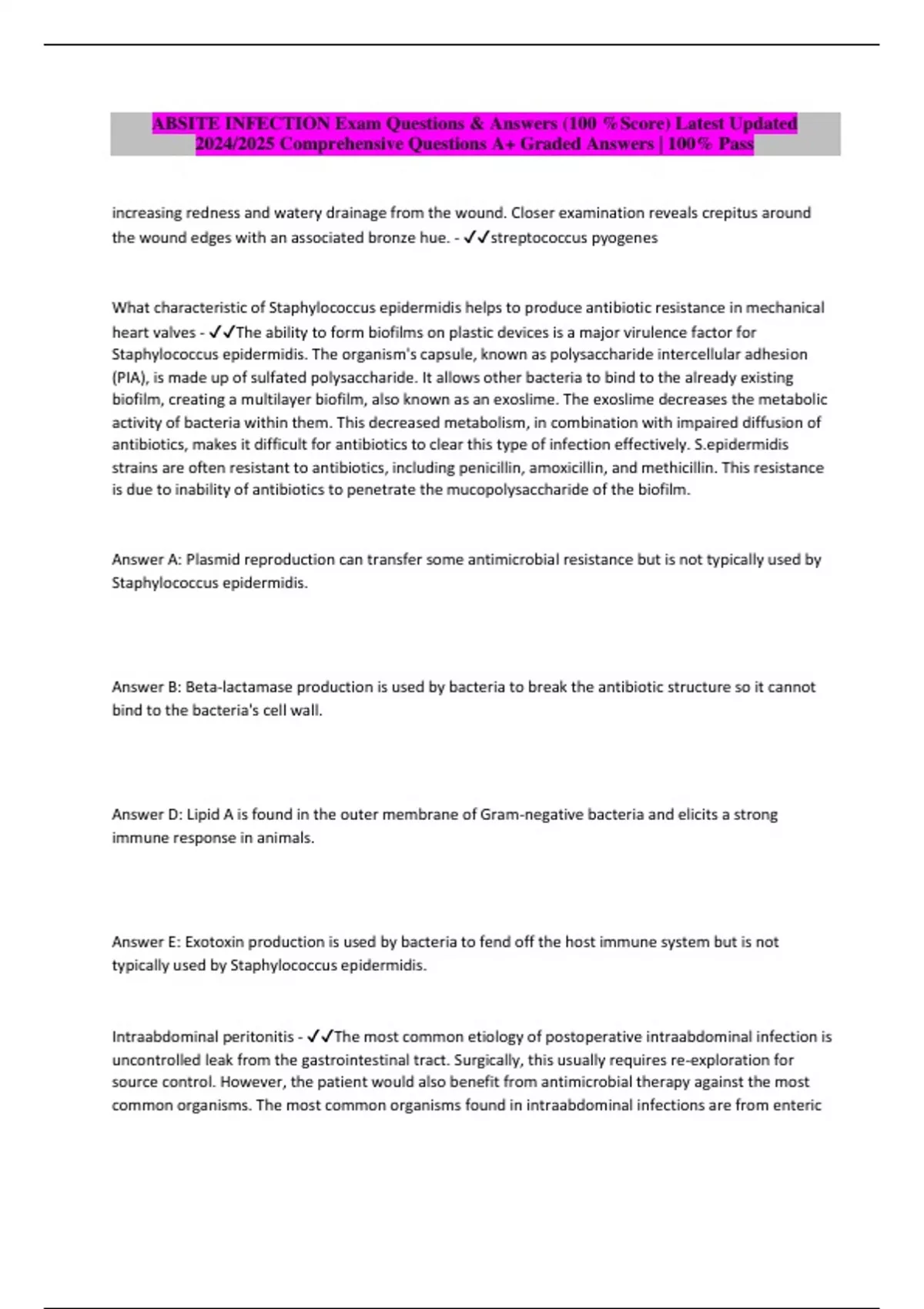 ABSITE INFECTION Exam Questions & Answers (100 %Score) Latest Updated 2024/2025 Comprehensive Questions A+ Graded Answers | 100% Pass