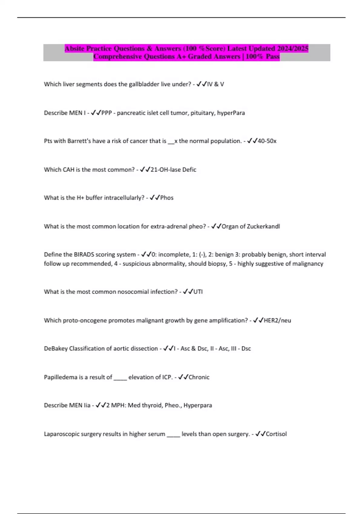 Package deal::: ABSITE Exams Qs & Answers (100 %Score) Latest updated 2024/2025 Comprehensive Questions A+ Graded Answers | 100% Pass