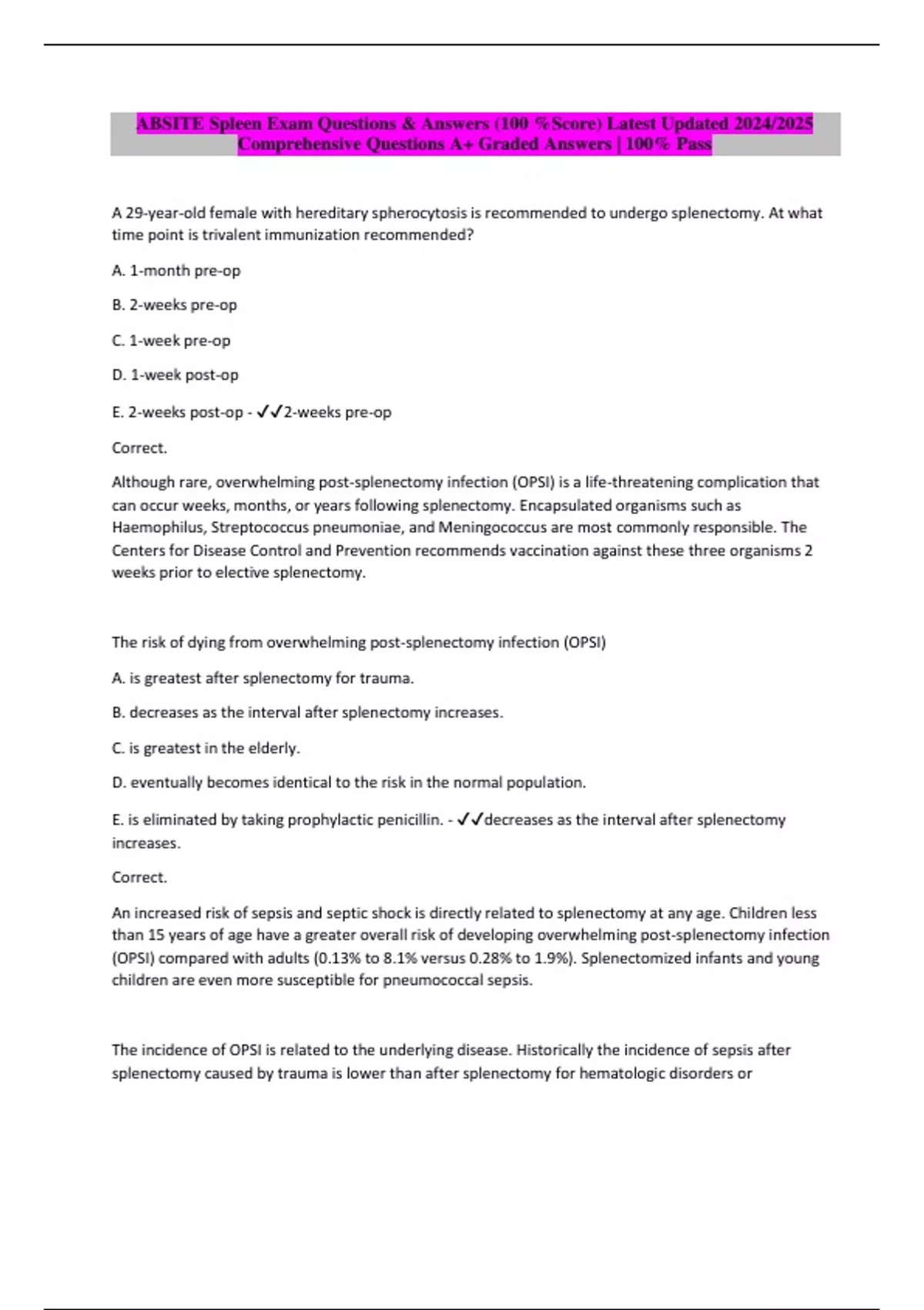 ABSITE Spleen Exam Questions & Answers (100 %Score) Latest Updated 2024/2025 Comprehensive Questions A+ Graded Answers | 100% Pass