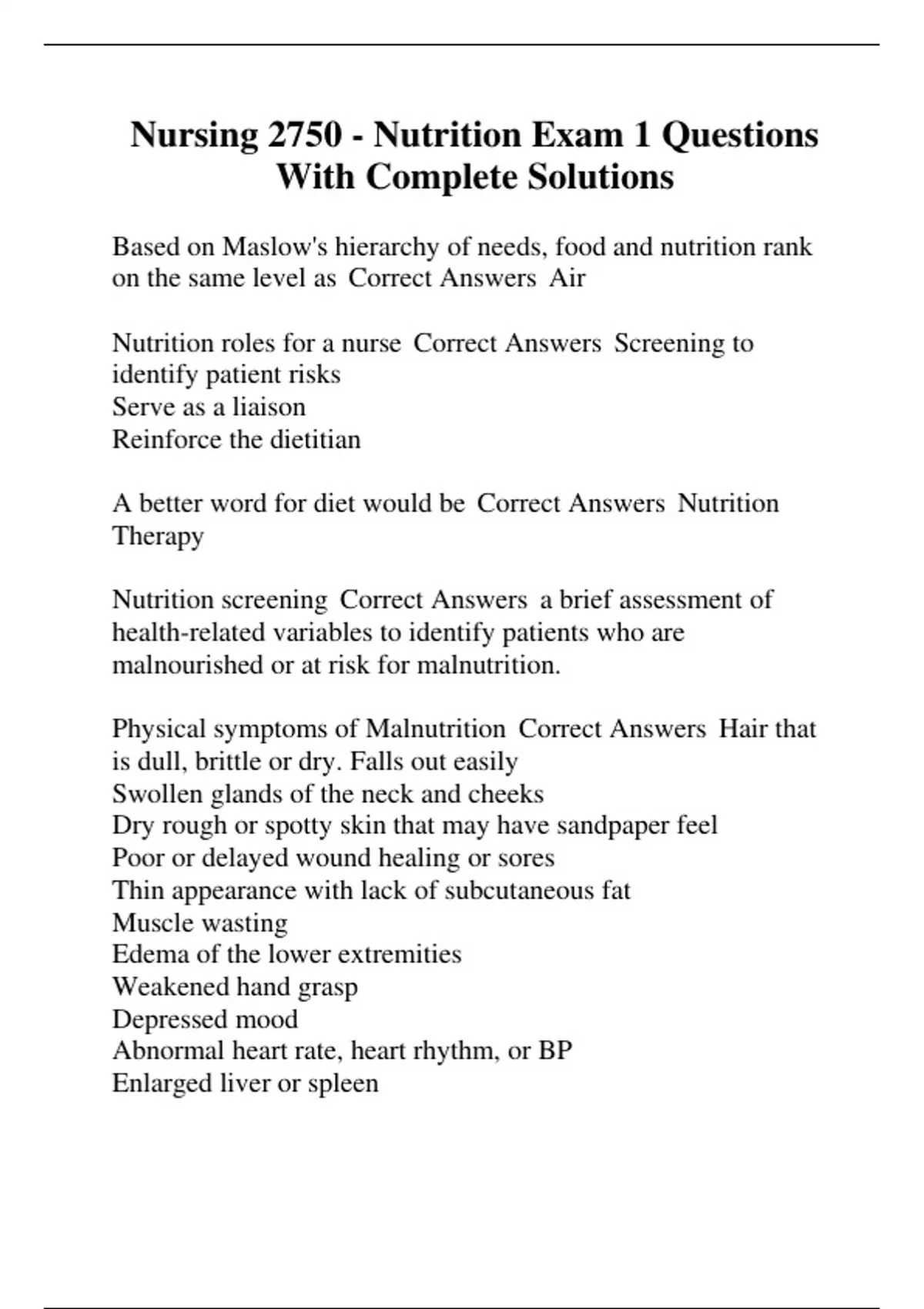 Nursing 2750 - Nutrition Exam 1 Questions With Complete Solutions