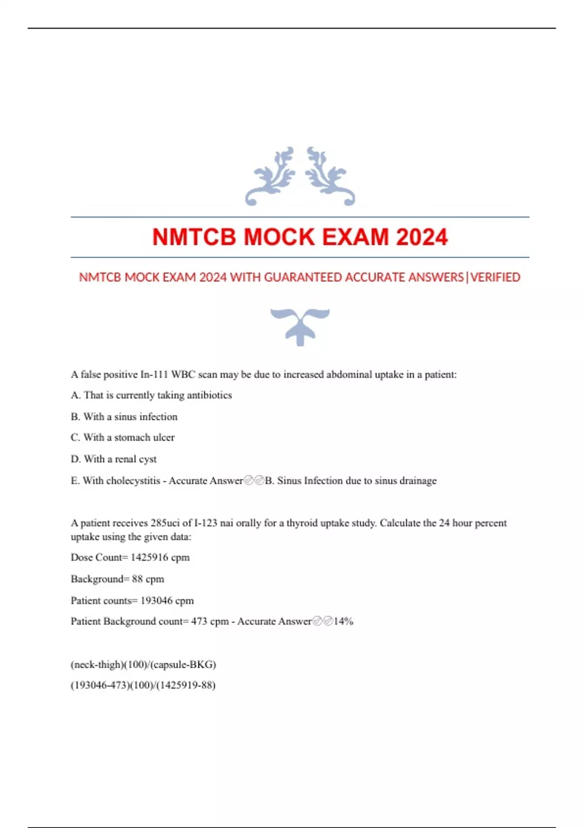 NMTCB MOCK EXAM 2024 NMTCB MOCK EXAM 2024 WITH GUARANTEED ACCURATE ANSWERS|VERIFIED A false positive In-111 WBC scan may be due to increased abdominal uptake in a patient: A. That is currently taking antibiotics B. With a sinus infection C. With a stomach ulcer D. With a renal cyst E. With cholecystitis - Accurate AnswerB. Sinus Infection due to sinus drainage A patient receives 285uci of I-123 nai orally for a thyroid uptake study. Calculate the 24 hour percent uptake using the given data: Dose Count= 1425916 cpm Background= 88 cpm Patient counts= 193046 cpm Patient Background count= 473 cpm - Accurate Answer14% (neck-thigh)(100)/(capsule-BKG) ()(100)/() The image was obtained while performing a WBB scan on a 62 year old male, the most probable reason for the appearance on the image is: A. Metastatic disease B. Trauma to chest wall C. Localized osteoporosis D. Osteomyelitis E. Paget's disease - Accurate AnswerB. Trauma to chest wall (metastatic will appear sporadically, pagets will show increase brain, femur, and pelvis. Trauma is usually displayed as a pattern) You are receiving a completed MPI pharmacologic study which of the following descriptions suggest that the patient has a myocardial infarction? A. Abnormal resting Tc99m tetrofosmin, normal stress Tc99m tetrofosmin B. Abnormal resting MIBI, normal stress Tl-201 Thallium Cl C. Normal resting Tc MIBI, normal stress Tl201 D. Abnormal resting Tl201, abnormal stress Tc MIBI E. Abnormal stress Tl201, normal redistribution Tl201 - Accurate AnswerD. Both resting and stress will appear abnormal to indicate an infarction Which electron transition process involves monochromatic incident X-ray yeilding a photon and other electron's conservation of energy by moving shells? - Accurate AnswerCharacteristic X Ray Production