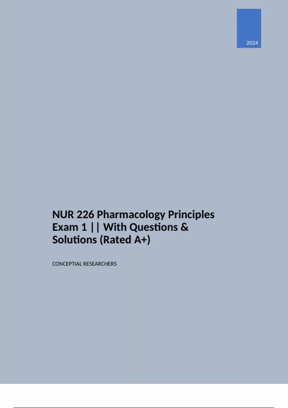NUR 226 Pharmacology Principles Exam 1 || With Questions & Solutions (Rated A+) NUR 226 Pharmacology Principles Exam 1 || With Questions & Solutions (Rated A+) what are the 3 phases of a drug action? - ANSWER - pharmaceutical, pharmacokinetic, pharmacodynamic describe the pharmaceutic phase of drug action - ANSWER - dissolution, the drug needs to dissolve to be able to absorb describe the pharmacokinetic phase - ANSWER - what the body does to the drug (contains absorption, distribution, metabolism, and excretion) what is absorption and where does it happen? - ANSWER - absorption is the movement of the drug from the site of consumption to the bloodstream, this occurs in the GI tract what is distribution and where does it occur? - ANSWER - drug from blood stream to tissues, occurs in cardiovascular what is metabolism and where does it occur? - ANSWER - this occurs in the liver and is the process of breaking down the drug what is excretion and where does it occur? - ANSWER - this occurs in the kidneys, liver, and bowl. drug getting out of the system describe the pharmacodynamic phase - ANSWER - what the drug does to the body the action of the drug or the mechanism of action the intended effect of the drug the therapeutic action cell membranes are composed of - ANSWER - layers of cells why must drugs pass through the cell membrane? - ANSWER - to get to the blood and site of action the membrane structure is a - ANSWER - phospholipid drugs must be what to pass the membrane?