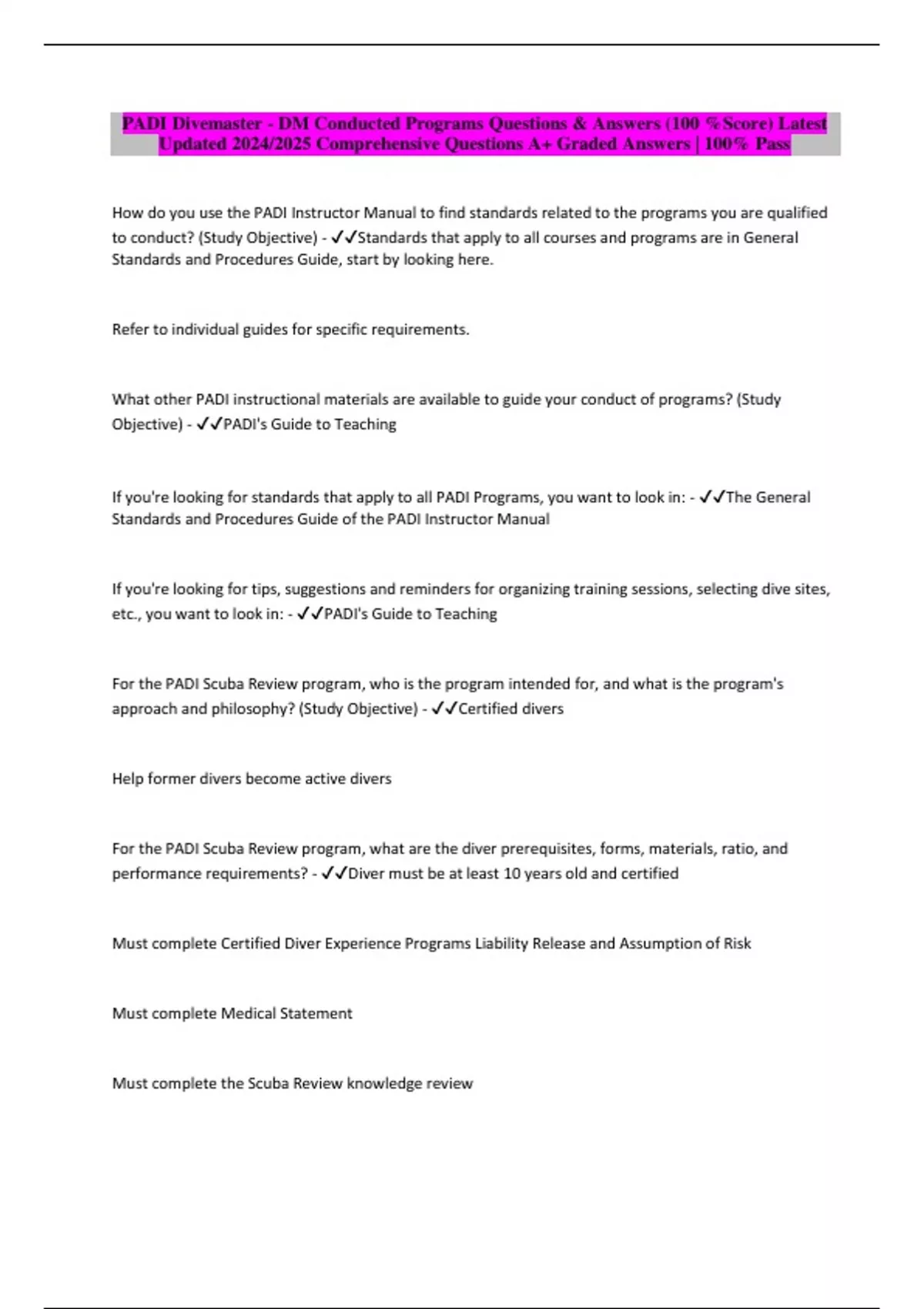 PADI Divemaster - DM Conducted Programs Questions & Answers (100 %Score) Latest Updated 2024/2025 Comprehensive Questions A+ Graded Answers | 100% Pass