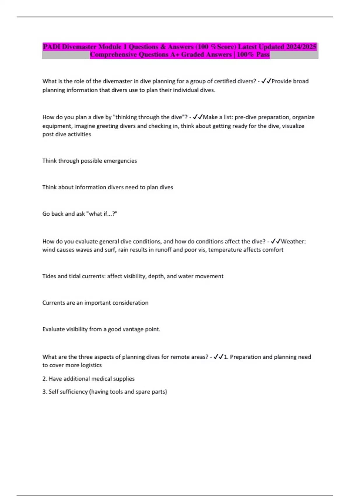 PADI Divemaster Module 1 Questions & Answers (100 %Score) Latest Updated 2024/2025 Comprehensive Questions A+ Graded Answers | 100% Pass