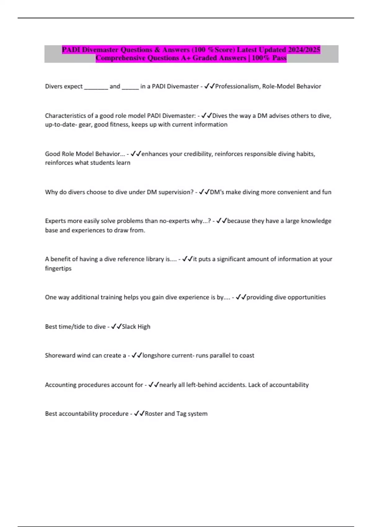 Package deal::: PADI Divemaster Exams Qs & Answers (100 %Score) Latest updated 2024/2025 Comprehensive Questions A+ Graded Answers | 100% Pass