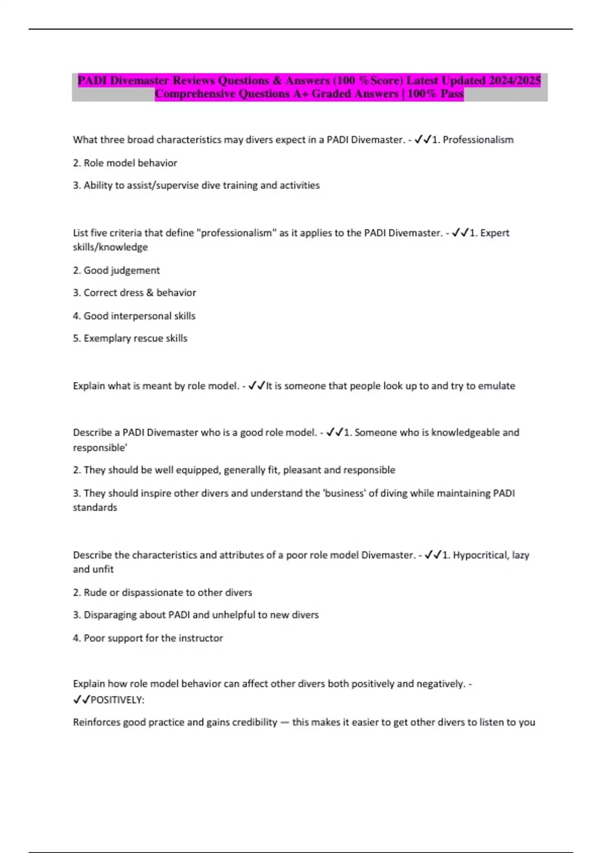 Package deal::: PADI Divemaster Exams Qs & Answers (100 %Score) Latest updated 2024/2025 Comprehensive Questions A+ Graded Answers | 100% Pass