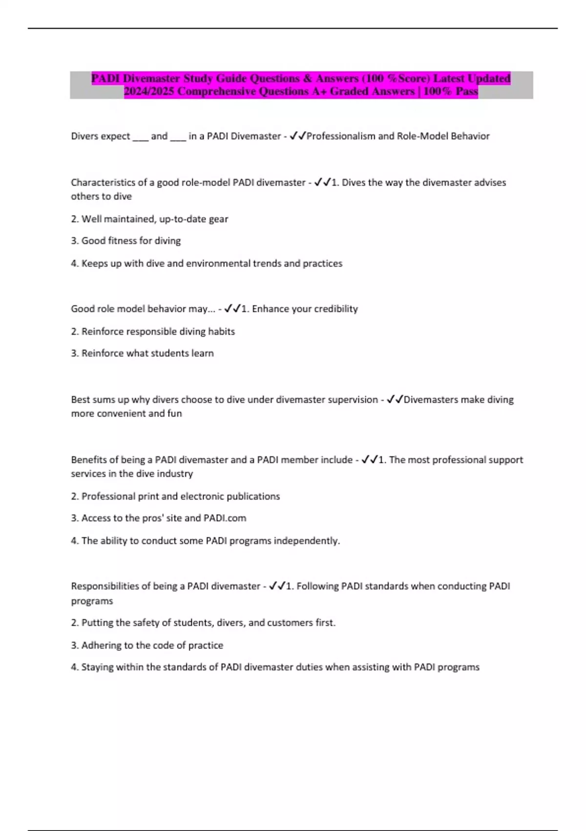 PADI Divemaster Study Guide Questions & Answers (100 %Score) Latest Updated 2024/2025 Comprehensive Questions A+ Graded Answers | 100% Pass