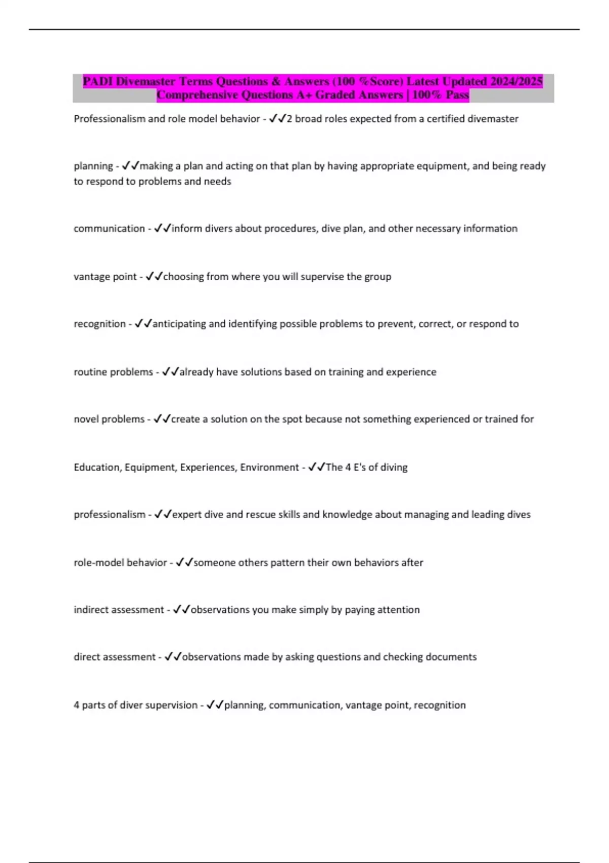 PADI Divemaster Terms Questions & Answers (100 %Score) Latest Updated 2024/2025 Comprehensive Questions A+ Graded Answers | 100% Pass