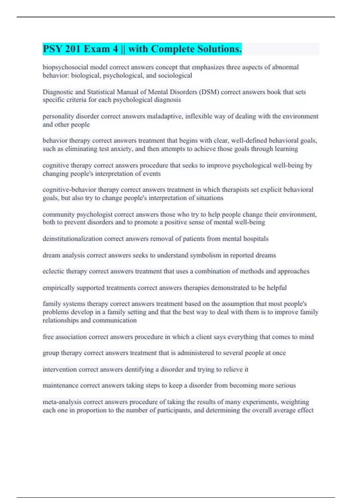 biopsychosocial model correct answers concept that emphasizes three aspects of abnormal behavior: biological, psychological, and sociological Diagnostic and Statistical Manual of Mental Disorders (DSM) correct answers book that sets specific criteria for each psychological diagnosis personality disorder correct answers maladaptive, inflexible way of dealing with the environment and other people behavior therapy correct answers treatment that begins with clear, well-defined behavioral goals, such as eliminating test anxiety, and then attempts to achieve those goals through learning cognitive therapy correct answers procedure that seeks to improve psychological well-being by changing people's interpretation of events cognitive-behavior therapy correct answers treatment in which therapists set explicit behavioral goals, but also try to change people's interpretation of situations community psychologist correct answers those who try to help people change their environment, both to prevent disorders and to promote a positive sense of mental well-being deinstitutionalization correct answers removal of patients from mental hospitals dream analysis correct answers seeks to understand symbolism in reported dreams eclectic therapy correct answers treatment that uses a combination of methods and approaches empirically supported treatments correct answers therapies demonstrated to be helpful family systems therapy correct answers treatment based on the assumption that most people's problems develop in a family setting and that the best way to deal with them is to improve family relationships and communication free association correct answers procedure in which a client says everything that comes to mind group therapy correct answers treatment that is administered to several people at once intervention correct answers dentifying a disorder and trying to relieve it maintenance correct answers taking steps to keep a disorder from becoming more serious meta-analysis correct answers procedure of taking the results of many experiments, weighting each one in proportion to the number of participants, and determining the overall average effect