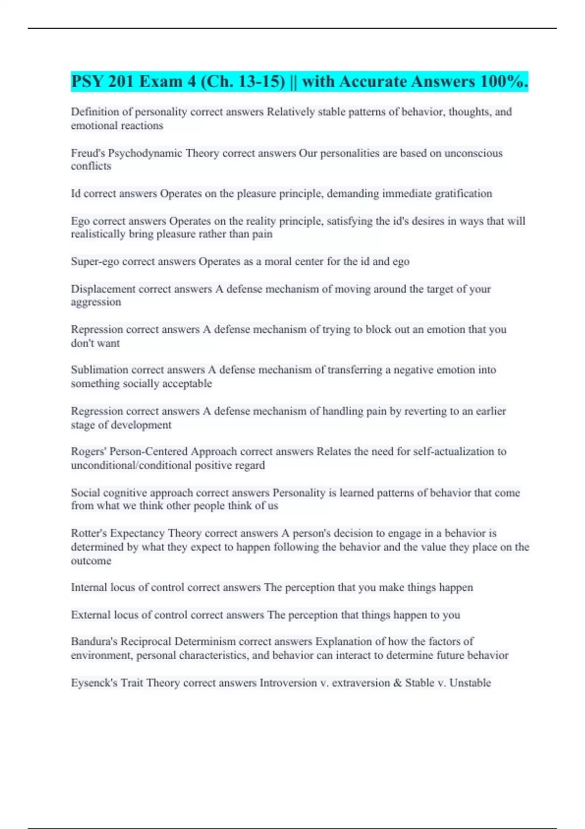 Definition of personality correct answers Relatively stable patterns of behavior, thoughts, and emotional reactions Freud's Psychodynamic Theory correct answers Our personalities are based on unconscious conflicts Id correct answers Operates on the pleasure principle, demanding immediate gratification Ego correct answers Operates on the reality principle, satisfying the id's desires in ways that will realistically bring pleasure rather than pain Super-ego correct answers Operates as a moral center for the id and ego Displacement correct answers A defense mechanism of moving around the target of your aggression Repression correct answers A defense mechanism of trying to block out an emotion that you don't want Sublimation correct answers A defense mechanism of transferring a negative emotion into something socially acceptable Regression correct answers A defense mechanism of handling pain by reverting to an earlier stage of development Rogers' Person-Centered Approach correct answers Relates the need for self-actualization to unconditional/conditional positive regard Social cognitive approach correct answers Personality is learned patterns of behavior that come from what we think other people think of us Rotter's Expectancy Theory correct answers A person's decision to engage in a behavior is determined by what they expect to happen following the behavior and the value they place on the outcome Internal locus of control correct answers The perception that you make things happen External locus of control correct answers The perception that things happen to you Bandura's Reciprocal Determinism correct answers Explanation of how the factors of environment, personal characteristics, and behavior can interact to determine future behavior Eysenck's Trait Theory correct answers Introversion v. extraversion & Stable v. Unstable