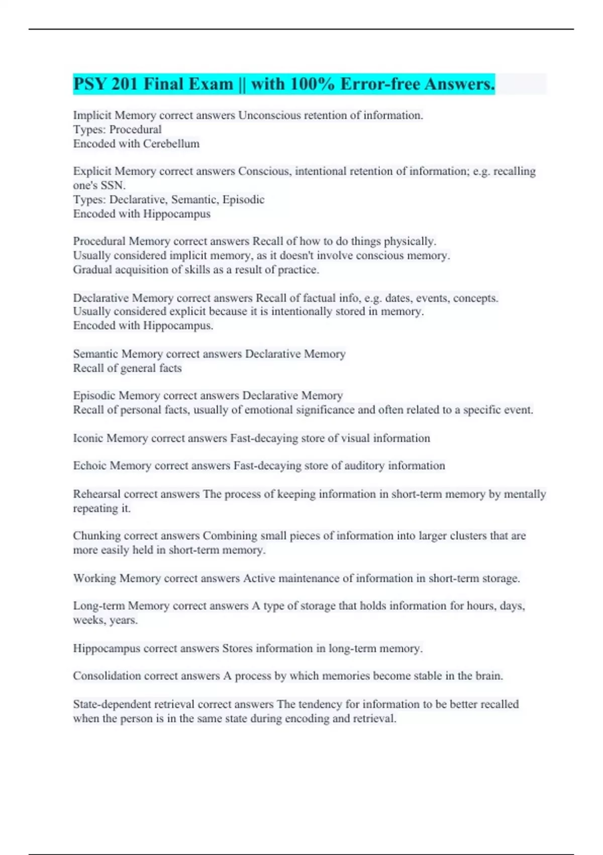 Implicit Memory correct answers Unconscious retention of information. Types: Procedural Encoded with Cerebellum Explicit Memory correct answers Conscious, intentional retention of information; e.g. recalling one's SSN. Types: Declarative, Semantic, Episodic Encoded with Hippocampus Procedural Memory correct answers Recall of how to do things physically. Usually considered implicit memory, as it doesn't involve conscious memory. Gradual acquisition of skills as a result of practice. Declarative Memory correct answers Recall of factual info, e.g. dates, events, concepts. Usually considered explicit because it is intentionally stored in memory. Encoded with Hippocampus. Semantic Memory correct answers Declarative Memory Recall of general facts Episodic Memory correct answers Declarative Memory Recall of personal facts, usually of emotional significance and often related to a specific event. Iconic Memory correct answers Fast-decaying store of visual information Echoic Memory correct answers Fast-decaying store of auditory information Rehearsal correct answers The process of keeping information in short-term memory by mentally repeating it. Chunking correct answers Combining small pieces of information into larger clusters that are more easily held in short-term memory. Working Memory correct answers Active maintenance of information in short-term storage. Long-term Memory correct answers A type of storage that holds information for hours, days, weeks, years. Hippocampus correct answers Stores information in long-term memory. Consolidation correct answers A process by which memories become stable in the brain. State-dependent retrieval correct answers The tendency for information to be better recalled when the person is in the same state during encoding and retrieval.