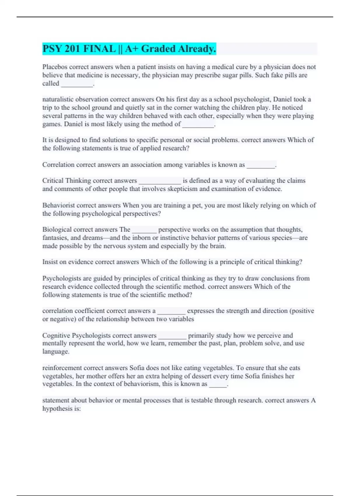 Placebos correct answers when a patient insists on having a medical cure by a physician does not believe that medicine is necessary, the physician may prescribe sugar pills. Such fake pills are called _________. naturalistic observation correct answers On his first day as a school psychologist, Daniel took a trip to the school ground and quietly sat in the corner watching the children play. He noticed several patterns in the way children behaved with each other, especially when they were playing games. Daniel is most likely using the method of _________. It is designed to find solutions to specific personal or social problems. correct answers Which of the following statements is true of applied research? Correlation correct answers an association among variables is known as ________. Critical Thinking correct answers ____________ is defined as a way of evaluating the claims and comments of other people that involves skepticism and examination of evidence. Behaviorist correct answers When you are training a pet, you are most likely relying on which of the following psychological perspectives? Biological correct answers The _______ perspective works on the assumption that thoughts, fantasies, and dreams—and the inborn or instinctive behavior patterns of various species—are made possible by the nervous system and especially by the brain. Insist on evidence correct answers Which of the following is a principle of critical thinking? Psychologists are guided by principles of critical thinking as they try to draw conclusions from research evidence collected through the scientific method. correct answers Which of the following statements is true of the scientific method? correlation coefficient correct answers a ________ expresses the strength and direction (positive or negative) of the relationship between two variables Cognitive Psychologists correct answers ________ primarily study how we perceive and mentally represent the world, how we learn, remember the past, plan, problem solve, and use language. reinforcement correct answers Sofia does not like eating vegetables. To ensure that she eats vegetables, her mother offers her an extra helping of dessert every time Sofia finishes her vegetables. In the context of behaviorism, this is known as _____. statement about behavior or mental processes that is testable through research. correct answers A hypothesis is: