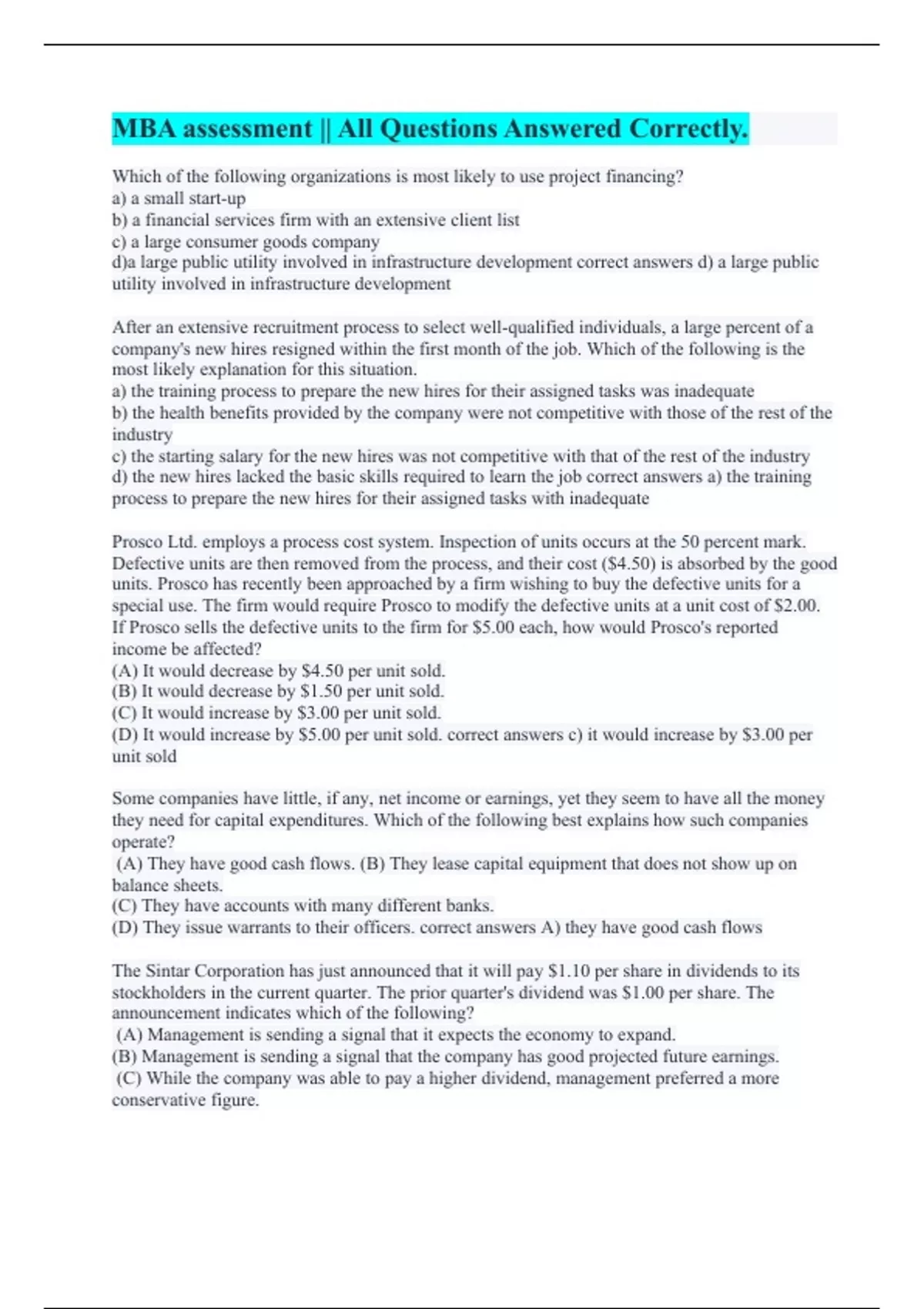 The Sintar Corporation has just announced that it will pay $1.10 per share in dividends to its stockholders in the current quarter. The prior quarter's dividend was $1.00 per share. The announcement indicates which of the following? (A) Management is sending a signal that it expects the economy to expand. (B) Management is sending a signal that the company has good projected future earnings. (C) While the company was able to pay a higher dividend, management preferred a more conservative figure. (D) The company has overextended its cash position and may have liquidity problems in the future. correct answers B) management is sending a signal that the company has good projected future earnings