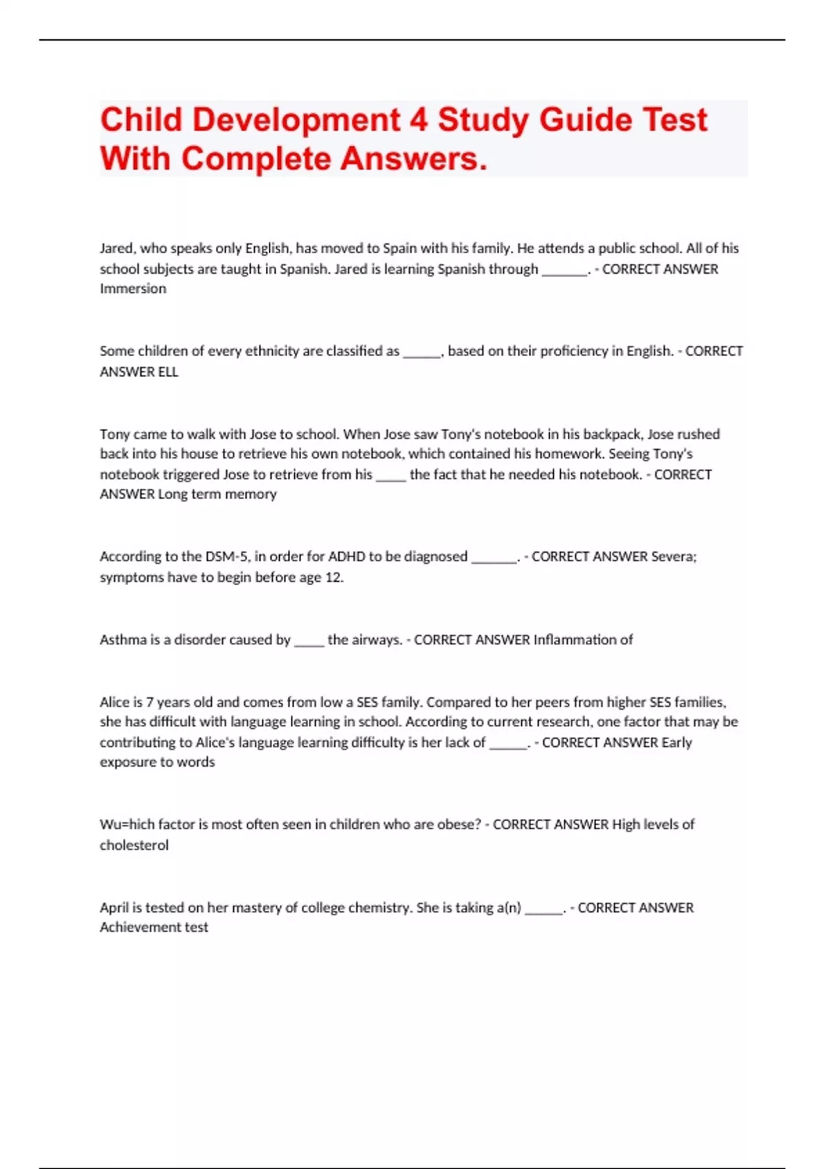 Child Development 4 Study Guide Test With Complete Answers. Jared, who speaks only English, has moved to Spain with his family. He attends a public school. All of his school subjects are taught in Spanish. Jared is learning Spanish through ______. - CORRECT ANSWER Immersion Some children of every ethnicity are classified as _____, based on their proficiency in English. - CORRECT ANSWER ELL Tony came to walk with Jose to school. When Jose saw Tony's notebook in his backpack, Jose rushed back into his house to retrieve his own notebook, which contained his homework. Seeing Tony's notebook triggered Jose to retrieve from his ____ the fact that he needed his notebook. - CORRECT ANSWER Long term memory According to the DSM-5, in order for ADHD to be diagnosed ______. - CORRECT ANSWER Severa; symptoms have to begin before age 12. Asthma is a disorder caused by ____ the airways. - CORRECT ANSWER Inflammation of Alice is 7 years old and comes from low a SES family. Compared to her peers from higher SES families, she has difficult with language learning in school. According to current research, one factor that may be contributing to Alice's language learning difficulty is her lack of _____. - CORRECT ANSWER Early exposure to words