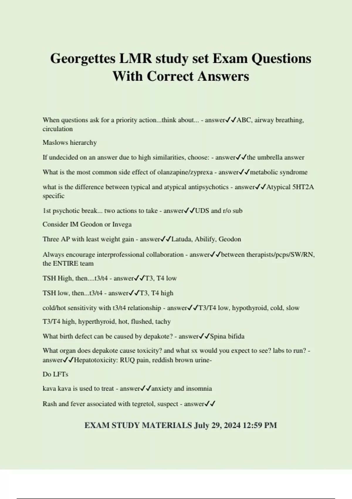 Georgettes LMR study set Exam Questions With Correct Answers When questions ask for a priority action...think about... - answerABC, airway breathing, circulation Maslows hierarchy If undecided on an answer due to high similarities, choose: - answerthe umbrella answer What is the most common side effect of olanzapine/zyprexa - answermetabolic syndrome what is the difference between typical and atypical antipsychotics - answerAtypical 5HT2A specific 1st psychotic break... two actions to take - answerUDS and r/o sub Consider IM Geodon or Invega Three AP with least weight gain - answerLatuda, Abilify, Geodon Always encourage interprofessional collaboration - answerbetween therapists/pcps/SW/RN, the ENTIRE team TSH High, then....t3/t4 - answerT3, T4 low TSH low, then...t3/t4 - answerT3, T4 high cold/hot sensitivity with t3/t4 relationship - answerT3/T4 low, hypothyroid, cold, slow T3/T4 high, hyperthyroid, hot, flushed, tachy What birth defect can be caused by depakote? - answerSpina bifida What organ does depakote cause toxicity? and what sx would you expect to see? labs to run? - answerHepatotoxicity: RUQ pain, reddish brown urine- Do LFTs kava kava is used to treat - answeranxiety and insomnia Rash and fever associated with tegretol, suspect - answer EXAM STUDY MATERIALS July 29, 2024 12:59 PM What allele is HLAB 1502 associated? - answerAsians. They CANNOT have tegretol. Test all asians for this allele. what rare and dangerous side effects are associated with tegretol - answerAplastic anemia Agranulocytosis-DC at ANC less than 1000 Sx's of agranulocytosis - answerunusual bleeding or bruising, mouth sores, infections, fever, sore throat, fatigue if starting a woman on lithium what test should be done? why? - answerHCG--risk of ebstein anomaly adverse s/e of lamictal/lamotrigine - answerSJS labs to checke BEFORE starting on lithium - answerBUN CRE urine protein What does protein in urine indicate - answerkidney impairment; 4+ protein in urine=you cannot start on lithium best choice med for decreasing si in bipolar disorder. - answerlithium best choice med for si in schizophrenia - answerclozaril best choice med for SI in borderline - answerlithium What medications will INCREASE Li levels - answerNSAIDS ACE's Thiazides/HCTZ Besides medications, what else can cause increased Li levels - answerdehydration hyponatremia lithium s/e inc N/V, which will effect electrolytes, and dehydration status what type of tremors will you see with lithium toxicity? - answercourse tremors lithium can cause what other comorbidities? - answerhypothyroidism maculopapular rash leukocytosis EXAM STUDY MATERIALS July 29, 2024 12:59 PM twave inversion what is a defining characteristic of NMS vs SS - answermuscle rigidity Sx's/labs associated with NMS - answerInc CPK, WBC, LFT Rhabdomyolosis myoglobinuria Can lead to mutism myoglobinuria/rhabdo can cause cherry colored urine Treatment for NMS and what each does - answerDC the offending agent bromocriptin-D2 agonis dantrolene: muscle relaxant Make sure if ? is asking for agonist or relaxant Sx of SS - answerHYPERREFLEXIA myoclonic jerks treatment for SS - answerciproheptadine how to best PREVENT SS - answerfollow proper transition protocols SSRI to MAOI=14 days Prozac to MAOI=5-6 weeks Triptans can also cause SS due to serotonin increase with use Why are SSRIs considered the safest for use in depression - answersafest for OD depressed patient presents with fatigue and low energy, consider: - answerNDRI wellbutrin sexual s/e with ssri? try... - answerwellbutrin due to lower risk of sexual s/e What medication must be avoided if client has seizure history or eating disorder? why? - answerwellbutrin due to decreasing the seizure threshold if client has depression and neuropathic pain - answerSNRI or TCA for treatment of BOTH What med class treats neuropathic pain