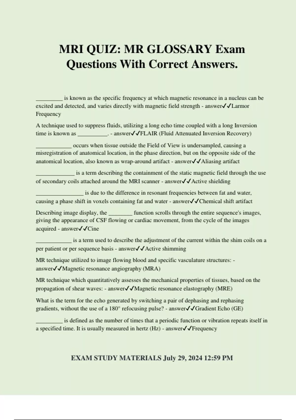 MRI QUIZ: MR GLOSSARY Exam Questions With Correct Answers