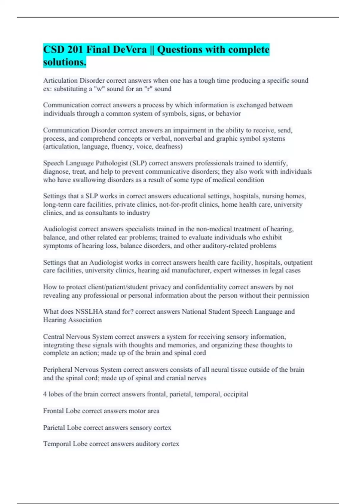 Articulation Disorder correct answers when one has a tough time producing a specific sound ex: substituting a "w" sound for an "r" sound Communication correct answers a process by which information is exchanged between individuals through a common system of symbols, signs, or behavior Communication Disorder correct answers an impairment in the ability to receive, send, process, and comprehend concepts or verbal, nonverbal and graphic symbol systems (articulation, language, fluency, voice, deafness) Speech Language Pathologist (SLP) correct answers professionals trained to identify, diagnose, treat, and help to prevent communicative disorders; they also work with individuals who have swallowing disorders as a result of some type of medical condition Settings that a SLP works in correct answers educational settings, hospitals, nursing homes, long-term care facilities, private clinics, not-for-profit clinics, home health care, university clinics, and as consultants to industry Audiologist correct answers specialists trained in the non-medical treatment of hearing, balance, and other related ear problems; trained to evaluate individuals who exhibit symptoms of hearing loss, balance disorders, and other auditory-related problems Settings that an Audiologist works in correct answers health care facility, hospitals, outpatient care facilities, university clinics, hearing aid manufacturer, expert witnesses in legal cases How to protect client/patient/student privacy and confidentiality correct answers by not revealing any professional or personal information about the person without their permission What does NSSLHA stand for? correct answers National Student Speech Language and Hearing Association Central Nervous System correct answers a system for receiving sensory information, integrating these signals with thoughts and memories, and organizing these thoughts to complete an action; made up of the brain and spinal cord Peripheral Nervous System correct answers consists of all neural tissue outside of the brain and the spinal cord; made up of spinal and cranial nerves 4 lobes of the brain correct answers frontal, parietal, temporal, occipital Frontal Lobe correct answers motor area Parietal Lobe correct answers sensory cortex Temporal Lobe correct answers auditory cortex