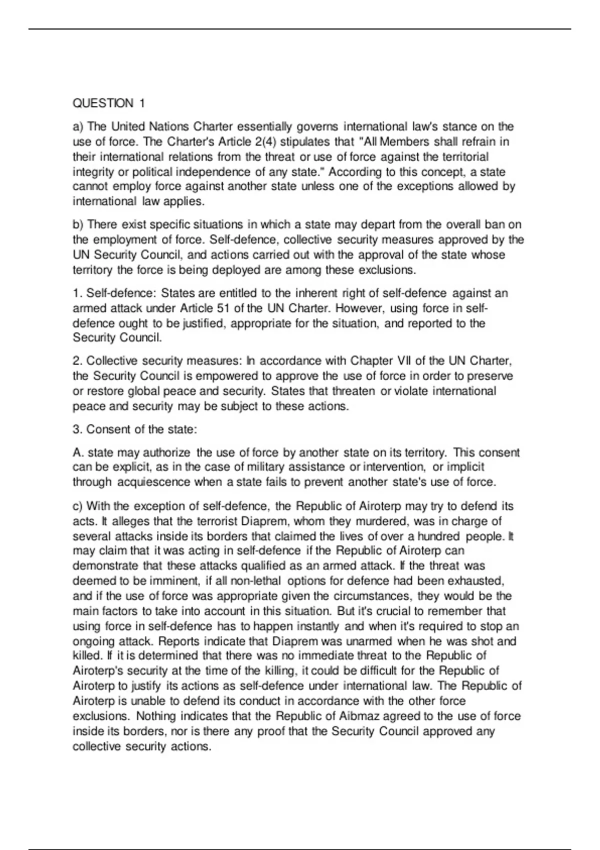 c) With the exception of self-defence, the Republic of Airoterp may try to defend its