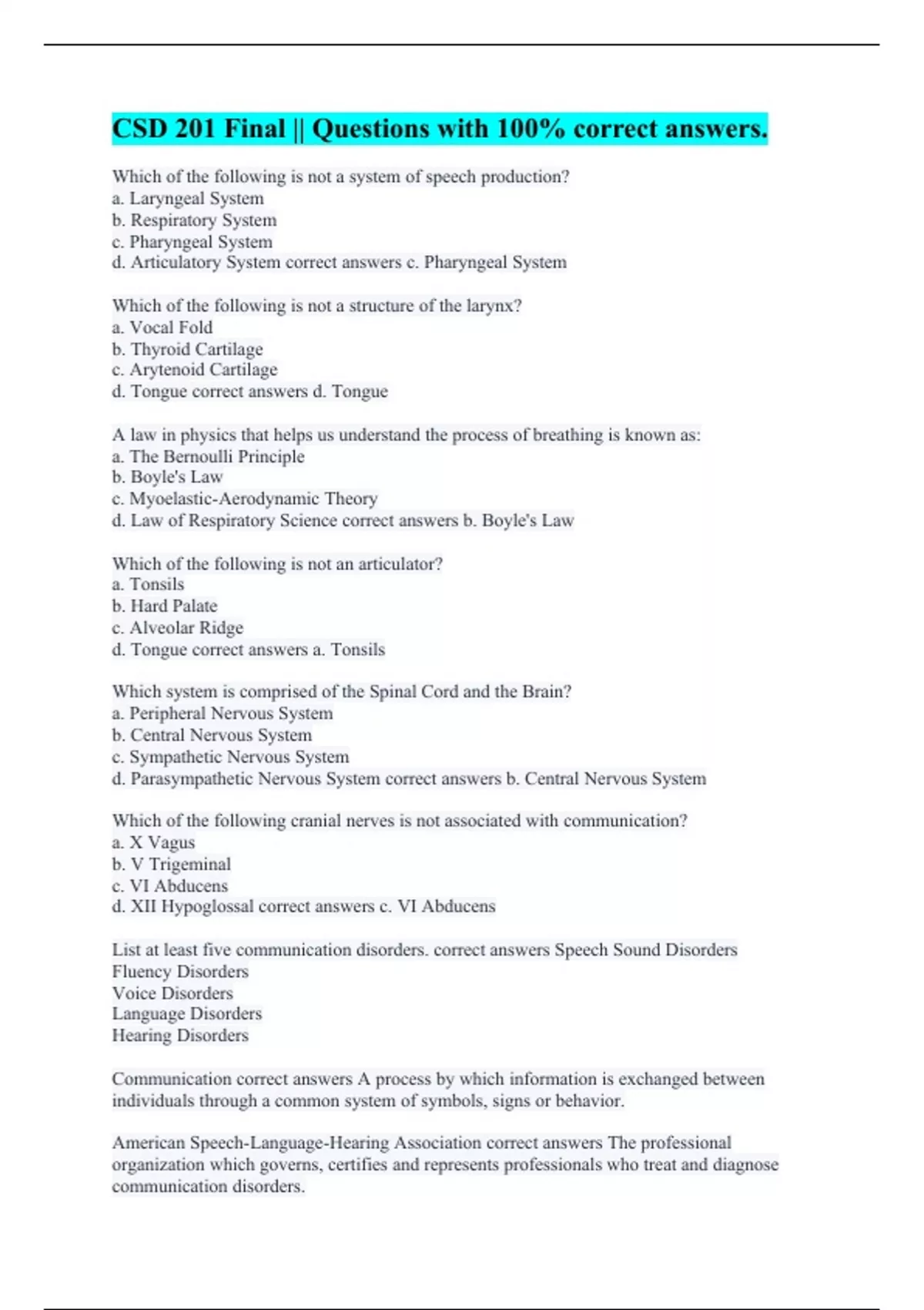 Which of the following is not a system of speech production? a. Laryngeal System b. Respiratory System c. Pharyngeal System d. Articulatory System correct answers c. Pharyngeal System Which of the following is not a structure of the larynx? a. Vocal Fold b. Thyroid Cartilage c. Arytenoid Cartilage d. Tongue correct answers d. Tongue A law in physics that helps us understand the process of breathing is known as: a. The Bernoulli Principle b. Boyle's Law c. Myoelastic-Aerodynamic Theory d. Law of Respiratory Science correct answers b. Boyle's Law Which of the following is not an articulator? a. Tonsils b. Hard Palate c. Alveolar Ridge d. Tongue correct answers a. Tonsils Which system is comprised of the Spinal Cord and the Brain? a. Peripheral Nervous System b. Central Nervous System c. Sympathetic Nervous System d. Parasympathetic Nervous System correct answers b. Central Nervous System Which of the following cranial nerves is not associated with communication? a. X Vagus b. V Trigeminal c. VI Abducens d. XII Hypoglossal correct answers c. VI Abducens List at least five communication disorders. correct answers Speech Sound Disorders Fluency Disorders Voice Disorders Language Disorders Hearing Disorders Communication correct answers A process by which information is exchanged between individuals through a common system of symbols, signs or behavior. American Speech-Language-Hearing Association correct answers The professional organization which governs, certifies and represents professionals who treat and diagnose communication disorders.