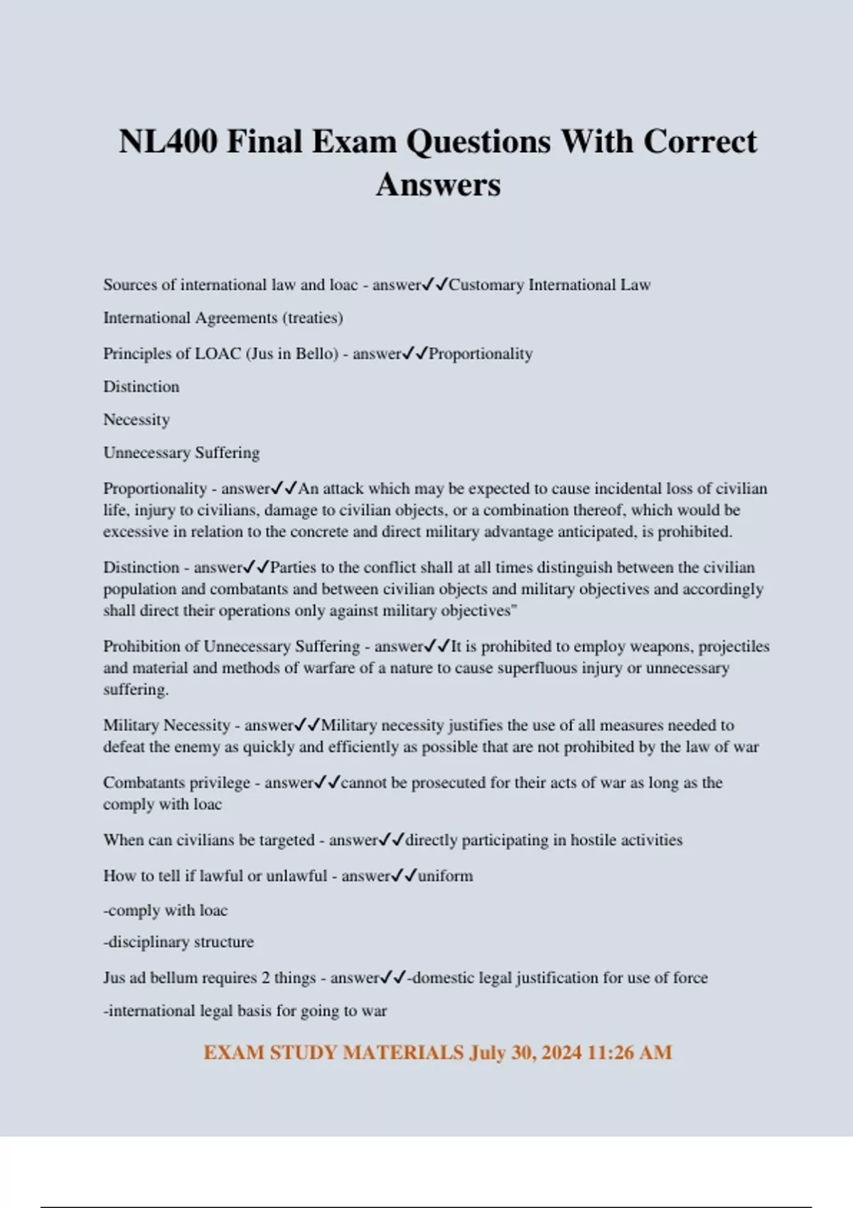 NL400 Final Exam Questions With Correct Answers Sources of international law and loac - answerCustomary International Law International Agreements (treaties) Principles of LOAC (Jus in Bello) - answerProportionality Distinction Necessity Unnecessary Suffering Proportionality - answerAn attack which may be expected to cause incidental loss of civilian life, injury to civilians, damage to civilian objects, or a combination thereof, which would be excessive in relation to the concrete and direct military advantage anticipated, is prohibited. Distinction - answerParties to the conflict shall at all times distinguish between the civilian population and combatants and between civilian objects and military objectives and accordingly shall direct their operations only against military objectives" Prohibition of Unnecessary Suffering - answerIt is prohibited to employ weapons, projectiles and material and methods of warfare of a nature to cause superfluous injury or unnecessary suffering. Military Necessity - answerMilitary necessity justifies the use of all measures needed to defeat the enemy as quickly and efficiently as possible that are not prohibited by the law of war Combatants privilege - answercannot be prosecuted for their acts of war as long as the comply with loac When can civilians be targeted - answerdirectly participating in hostile activities How to tell if lawful or unlawful - answeruniform -comply with loac -disciplinary structure Jus ad bellum requires 2 things - answer-domestic legal justification for use of force -international legal basis for going to wa