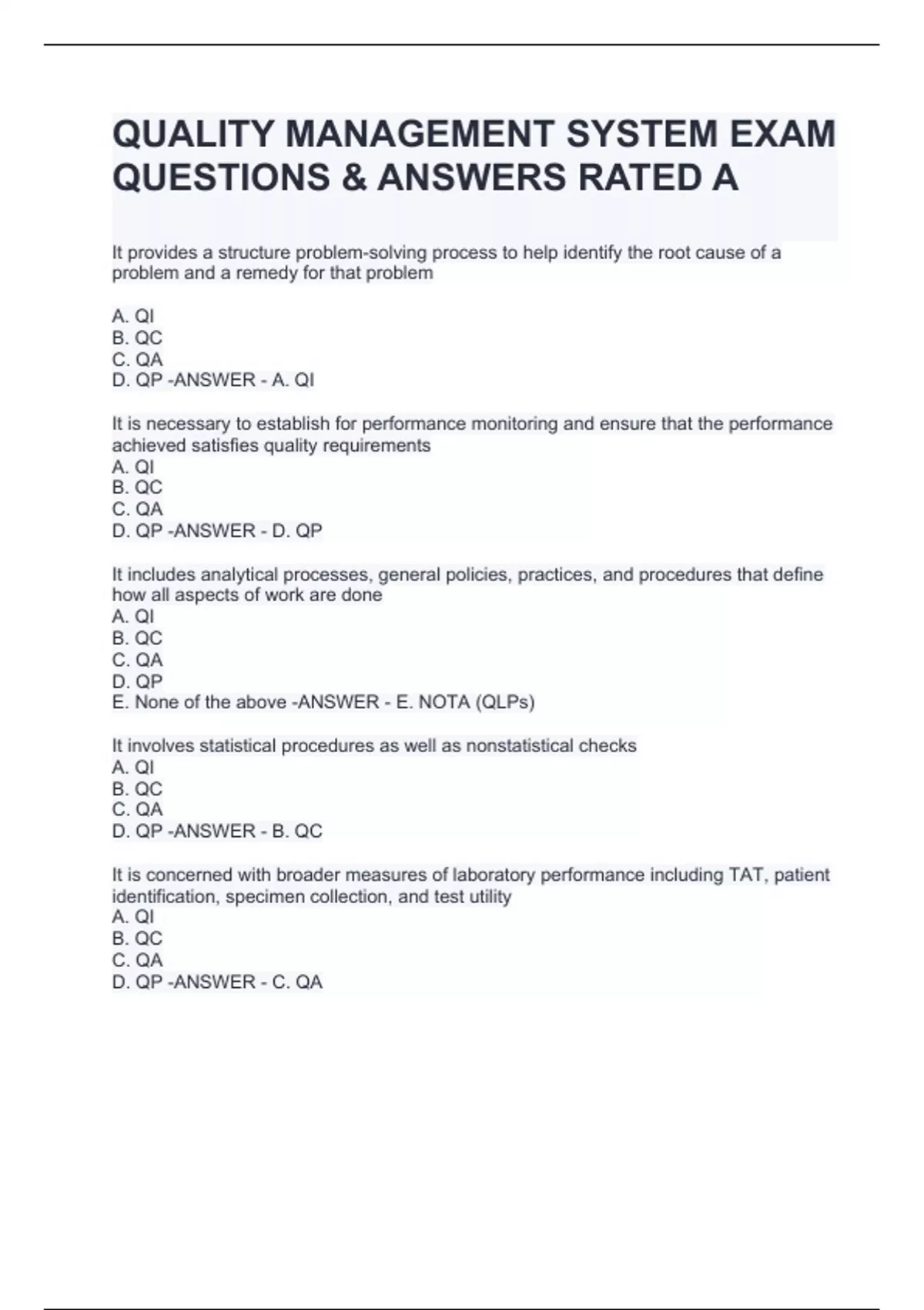 QUALITY MANAGEMENT SYSTEM EXAM QUESTIONS & ANSWERS RATED A