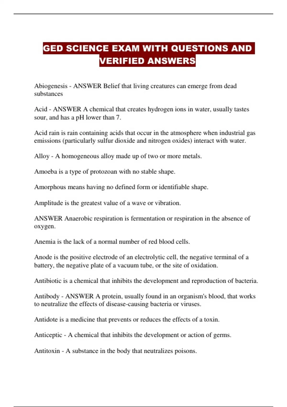 GED SCIENCE EXAM WITH QUESTIONS AND VERIFIED ANSWERS Abiogenesis - ANSWER Belief that living creatures can emerge from dead substances Acid - ANSWER A chemical that creates hydrogen ions in water, usually tastes sour, and has a pH lower than 7. Acid rain is rain containing acids that occur in the atmosphere when indust rial gas emissions (particularly sulfur dioxide and nitrogen oxides) interact with water. Alloy - A homogeneous alloy made up of two or more metals. Amoeba is a type of protozoan with no stable shape. Amorphous means having no defined form or identifiable shape. Amplitude is the greatest value of a wave or vibration. ANSWER Anaerobic respiration is fermentation or respiration in the absence of oxygen. Anemia is the lack of a normal number of red blood cells. Anode is the positive electrode of an electrolytic cell, the negative terminal of a battery, the negative plate of a vacuum tube, or the site of oxidation. Antibiotic is a chemical that inhibits the development and reproducti on of bacteria. Antibody - ANSWER A protein, usually found in an organism's blood, that works to neutralize the effects of disease-causing bacteria or viruses. Antidote is a medicine that prevents or reduces the effects of a toxin. Anticeptic - A chemical that inhibits the development or action of germs. Antitoxin - A substance in the body that neutralizes poisons. Appendix - ANSWER A wormlike, narrow portion of the alimentary canal locat ed in the lower right part of the human abdomen. Armature is a piece of metal or a coil of wire that travels back and forth, or rotates, in a magnetic field. An artery is a blood vessel that transports blood from the heart to the rest of the body. Arthropods are a collection of creatures with jointed legs, an exoskeleton, bilateral symmetry, and sexual reproduction, including insects, arachnids, mil lipedes, cenitpedes, and crustaceans. Citrus fruits, tomatoes, and green vegetables contain ascorbic acid, sometimes known as vitamin C. Aseptic means free of living microorganisms. Asexual reproduction entails producing offspring without the invol vement of individual or germ cells. Assimilation is the process by which the body uses digested food t o grow or repair cells. Assimilation is the process by which the body uses digested food t o grow or repair cells. Asteroid - ANSWER One of the "minor plants" between Mars and Jupiter, of which approximately 1,500 are known. The entire mass of gases around a planet is referred to as its atmosphere. Atom - ANSWER smallest particle of an element, consisting of a nucleus surrounded bynelectrons Atomic fission is the breakdown of an atomic nucleus into two or more components, resulting in a significant release of energy. ANSWER Atomic fusion is the merging of atomic nuclei to form heavier nuclei, such as deuterium (heavy hydrogen) and tritium (another isotope of hydrogen) t o make helium, leading in the release of tremendous amounts of energy. Auricle - ANSWER An upper chamber of the heart that collects blood from the veins, also known as the atrium Autotroph - ANSWER Organism (a green plant) that supports itself by producin g organic components from inorganic Auxin is a plant hormone that promotes root development and bud expa nsion. Bacillus is an aerobic, rod-shaped spore-producing bacterium. Bacteria - Answer (microbiology) single-celled or noncellular spherical, spira l, or rod-shaped creatures lacking chlorophyll that reproduce via fission. Balance in Nature: ANSWER the balance of animals and plants in their environment. Barometer is an instrument that measures atmospheric pressure. Basel Metabolism - ANSWER A phrase that describes how much energy the bod y expends when it is sedentary or basic (basal). A base is any water-soluble substance that can turn litmus blue and react wit h an acid to produce salt and water. Bedrock is a solid, unweathered rock that lies beneath soil deposits on the surface. Benign Tumor - A tumor that is not malignant. Bile is a digestive liquid produced by the liver and retained in the gallbla dder. Binomal nomenclature is a naming system for organisms in which each creature is given a two-part name --a genus name of various species in a region. A biome is a significant biotic community characterized by the primary forms of plant life and the prevailing climate. Biospy - ANSWER extracting and analyzing live tissue from a living bei ng The brain is the component of the central nervous system that houses all of th e higher nerve centers. Bronchial tube is one of the two tubes that branch out from the trachea and enter the lungs. Calorie is a unit of heat defined as the amount of heat necessary to raise the temperature of one gram of water by one degree centigrade under atmospheric pressure. Cancer - A malignant growth or tumor produced by abnormal and uncontrolled cell division. Capillary - Answer: long and narrow with a very small internal diameter.