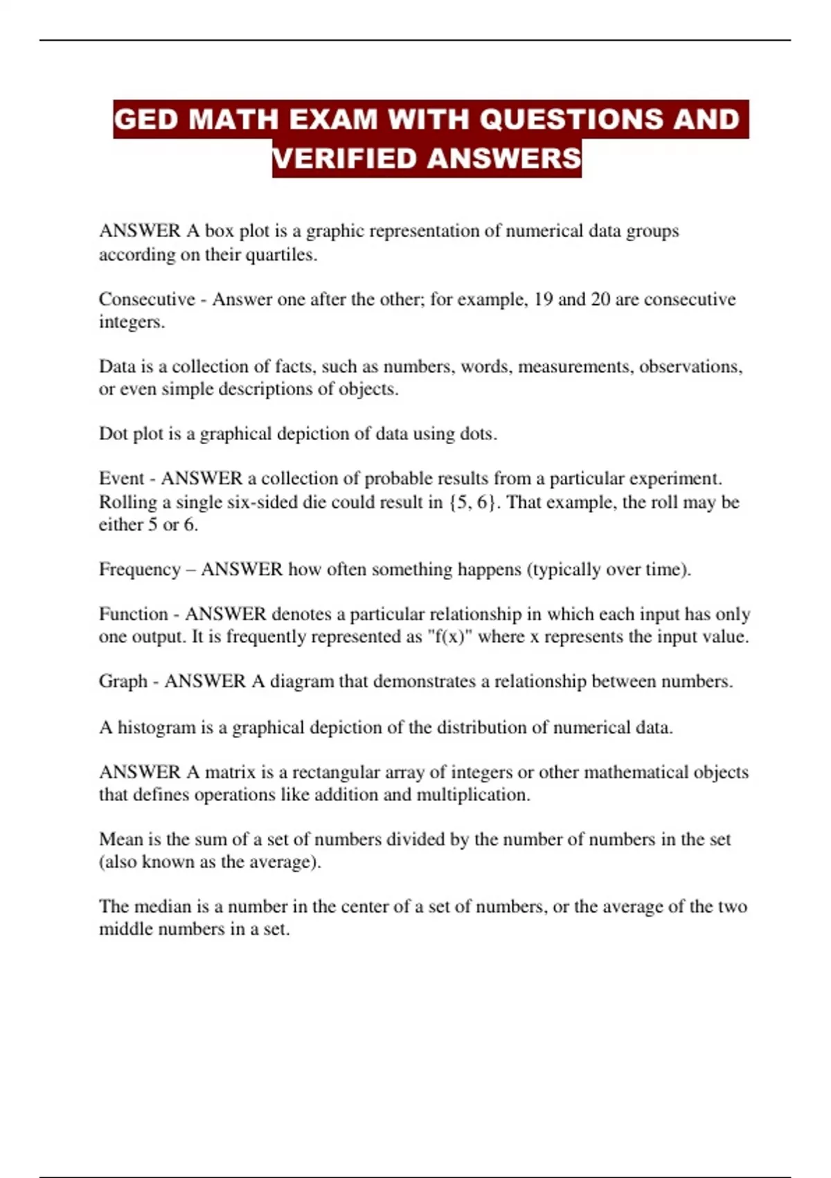 GED MATH EXAM WITH QUESTIONS AND VERIFIED ANSWERS ANSWER A box plot is a graphic representation of numerical data groups according on their quartiles. Consecutive - Answer one after the other; for example, 19 and 20 are consecutive integers. Data is a collection of facts, such as numbers, words, measurements, observatio ns, or even simple descriptions of objects. Dot plot is a graphical depiction of data using dots. Event - ANSWER a collection of probable results from a particular experiment. Rolling a single six-sided die could result in {5, 6}. That example, t he roll may be either 5 or 6. Frequency – ANSWER how often something happens (typically over time). Function - ANSWER denotes a particular relationship in which each input has onl y one output. It is frequently represented as "f(x)" where x represents the input value. Graph - ANSWER A diagram that demonstrates a relationship between numbers. A histogram is a graphical depiction of the distribution of numerical dat a. ANSWER A matrix is a rectangular array of integers or other mathematical objects that defines operations like addition and multiplication. Mean is the sum of a set of numbers divided by the number of numbers in the set (also known as the average). The median is a number in the center of a set of numbers, or the average of the two middle numbers in a set. Mode: ANSWER The most common number in a collection is known as its mod e. In the set {1,5,7,5,9}, the mode is 5, as there are two fives and only one of each other. Periodicity is the tendency of a function to repeat itself in a regular pattern at predetermined intervals. Permutation - ANSWER is the act of rearranging, or permuting, all of the members of a set into some sequence or order. Probability is the likelihood of an event occurring, commonly stated as t he ratio of the number of favorable outcomes to the total number of outcomes. Proportion - A statement that two ratios (or fractions) are equal. Rate of change is the change in the value of a quantity divided by the elapsed t ime. In scientific notation, a number is represented as the product of a number be tween 1 and 10 and a power of 10. Standard deviation is a measure of how spread apart statistics are. Table - An orderly graphic or list of numbers. Unit rate - ANSWER specifies how many units of the first type of quantit y equal one unit of the second type of quantity. Some frequent unit rates are miles (or kilometers) per hour, cost per item, weekly wages, and so on. Ratio - a comparison of two numbers. The word "to" is separated by a colon (:) an d may be written in fractional form. Proportion - ANSWER an equation demonstrating that two ratios are equival ent. Numbers can fluctuate in value but maintain the same proportionate relationshi p to one another. Cross Products - ANSWER The product of diagonal numbers in a percentage equation. Should be equal on both sides. The common denominator of a set of fractions is a number that each denominator may divide equally. The denominator is the bottom number in a fraction. Difference - Answer the solution to a subtraction problem. Digit - Select one of the 10 number symbols. The digits are: 0, 1, 2, 3, 4, 5, 6, 7, 8, 9. Equation - answer a statement that two quantities are equal. Estimate - as a term, an approximate value. as a verb: to determine an approximate value. Fraction - Answer a portion of a whole. ANSWER: The biggest factor that splits two numbers. ANSWER An improper fraction is one in which the numerator is more than or equal to the denominator.
