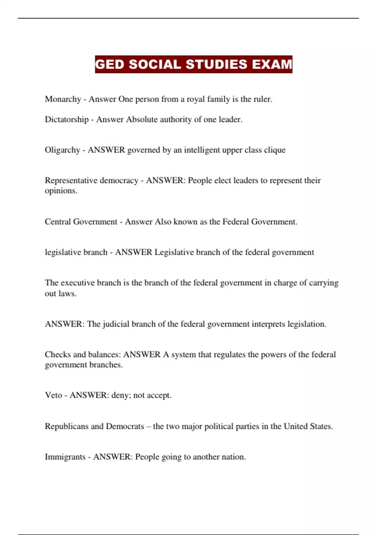 GED SOCIAL STUDIES EXAM Monarchy - Answer One person from a royal family is the ruler. Dictatorship - Answer Absolute authority of one leader. Oligarchy - ANSWER governed by an intelligent upper class clique Representative democracy - ANSWER: People elect leaders to represent their opinions. Central Government - Answer Also known as the Federal Government. legislative branch - ANSWER Legislative branch of the federal governmen t The executive branch is the branch of the federal government in charge of carrying out laws. ANSWER: The judicial branch of the federal government interprets legislatio n. Checks and balances: ANSWER A system that regulates the powers of the federal government branches. Veto - ANSWER: deny; not accept. Republicans and Democrats – the two major political parties in the United States. Immigrants - ANSWER: People going to another nation.